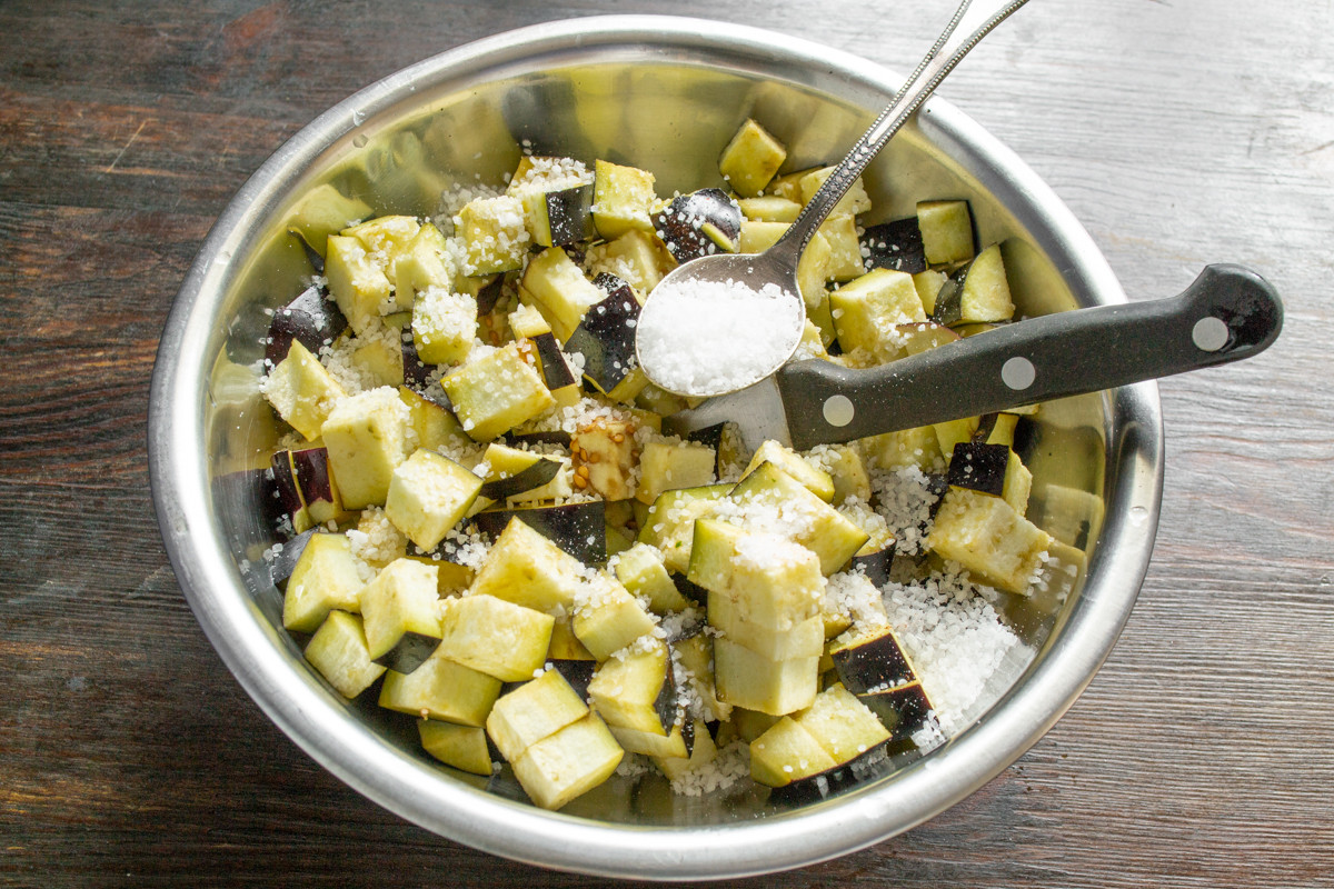 Аккуратно перемешиваем баклажаны с солью. Можно чуть прижать, чтобы соль быстрее растворилась.