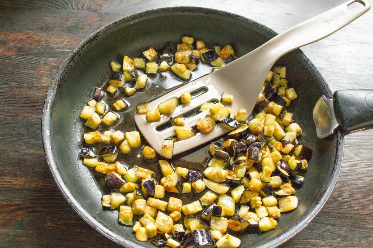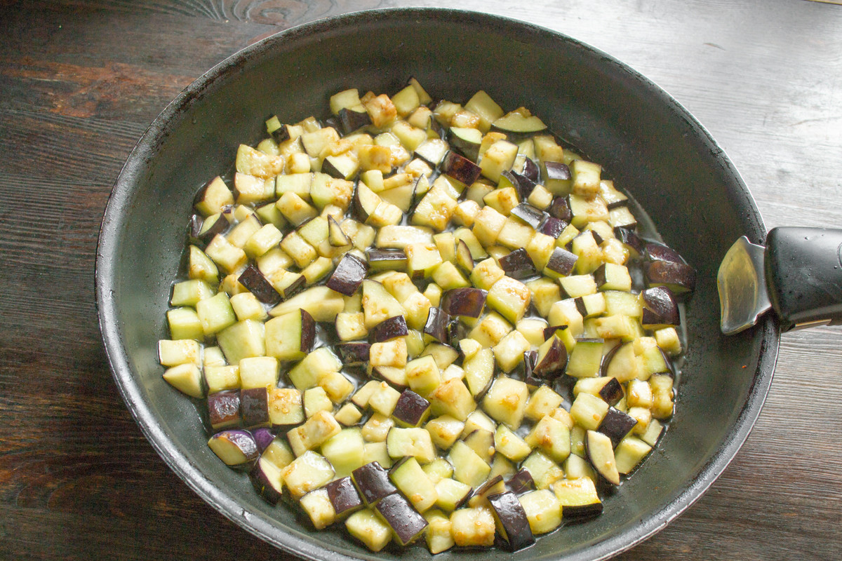 В широкую сковороду с толстым дном наливаем рафинированное растительное масло без запаха. Нагреваем сковороду с маслом, выкладываем обсушенные кубики баклажанов.
