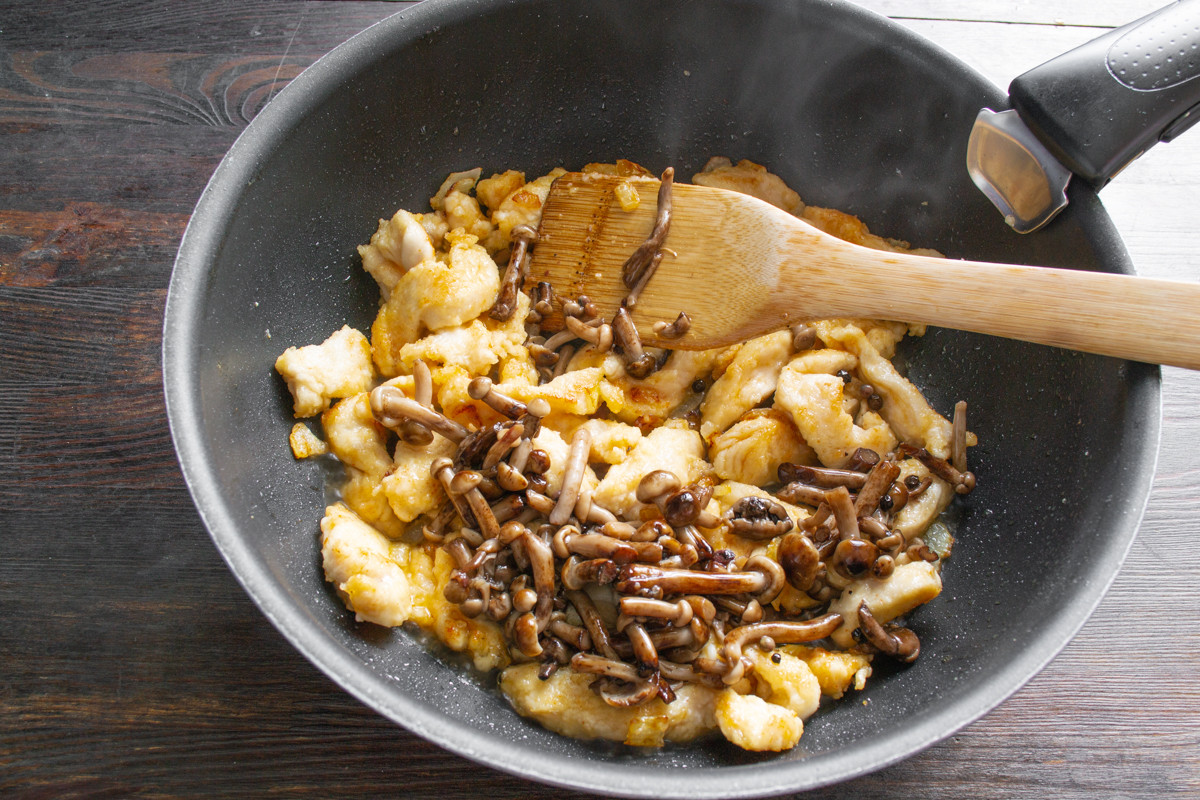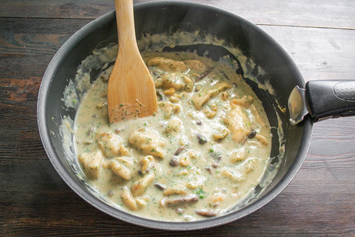 Если готовите блюдо со свежими лесными грибами, то их необходимо отварить почти до готовности отдельно, на варку понадобится 20-30 минут в зависимости от вида грибов.