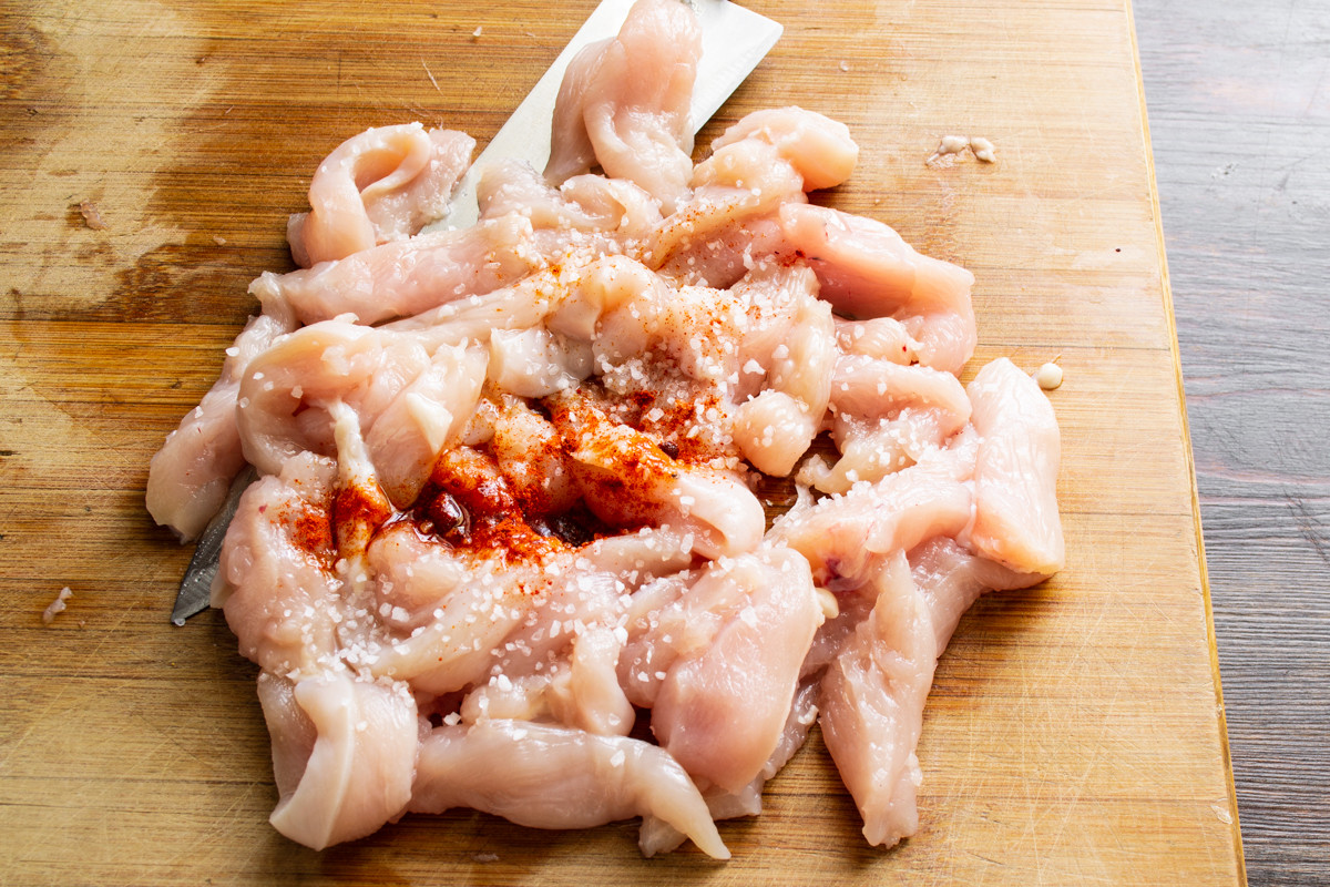 Куриную грудку нарезаем поперек волокон длинными узкими полосками. Посыпаем курицу солью, по вкусу перчим красным или черным молотым перцем.