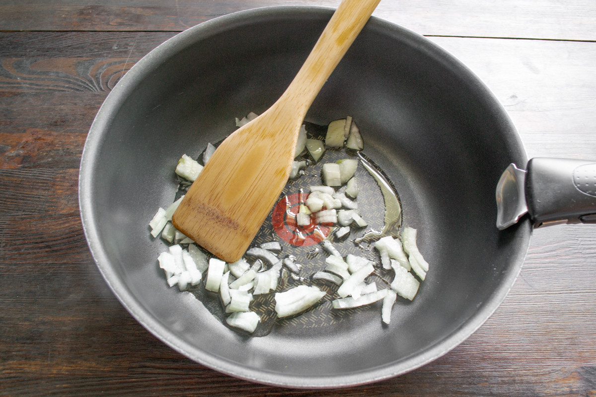 В глубокую сковороду или сотейник с толстым дном вливаем 1 столовую ложку растительного масла без запаха. Бросаем нарезанную мелкими кубиками луковицу, обжариваем несколько минут.