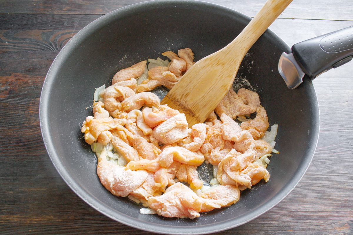 В пакет насыпаем 1 столовую ложку муки, бросаем нарезанное куриное филе, встряхиваем. Выкладываем панированные кусочки в сковороду к обжаренному луку. Готовим на сильном огне несколько минут, чтобы куриное филе подрумянилось.