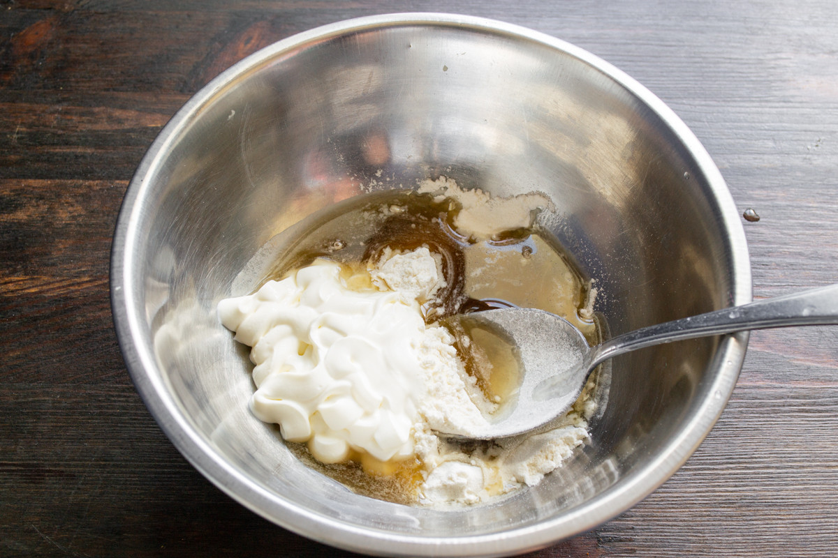 Пока курица жарится, смешаем соус. В миску кладем сметану, насыпаем 1 столовую ложку пшеничной муки (без горки под нож). Смешиваем вилкой или венчиком, постепенно вливаем холодный куриный или грибной бульон.