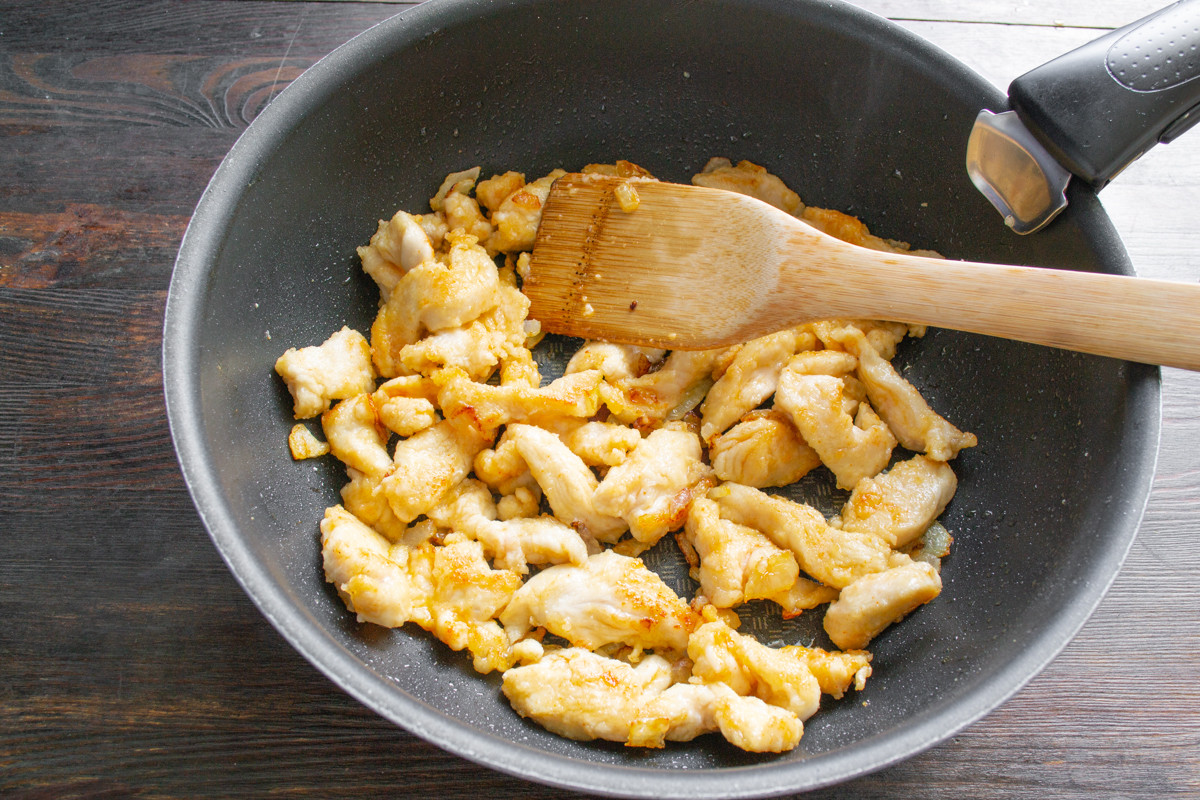 Нарезайте куриное филе полосками толщиной чуть меньше сантиметра, тщательно панируйте и обжаривайте в масле на сильном огне. Так куриное филе останется сочным.