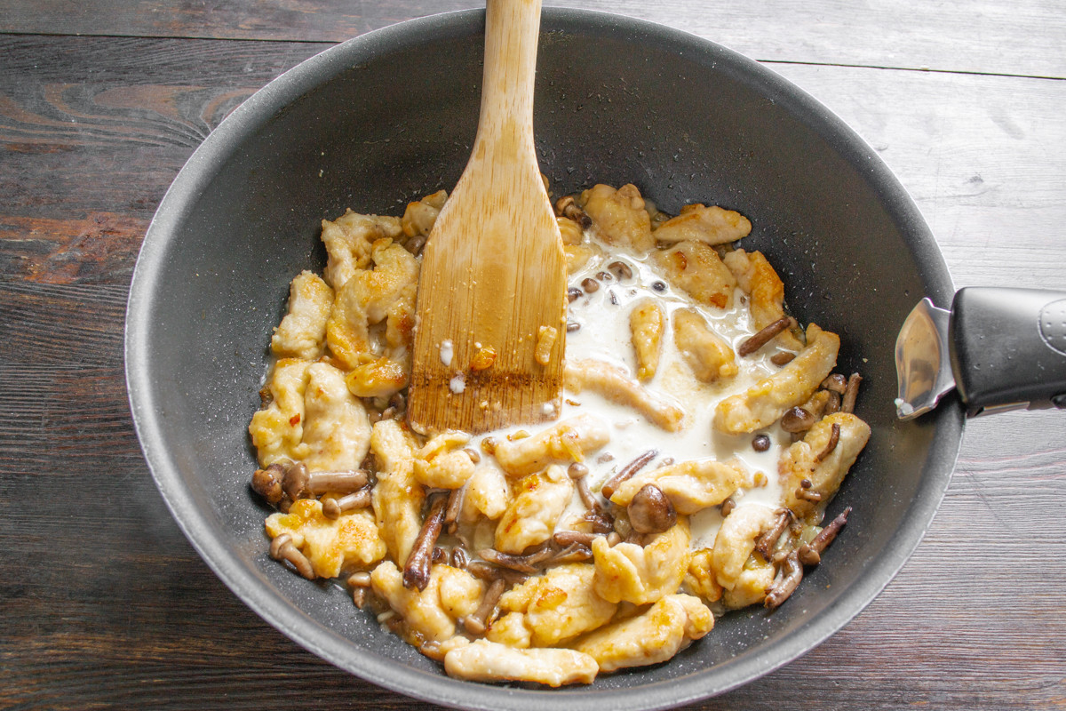 Быстро обжариваем курицу с грибами, небольшими порциями вливаем соус.