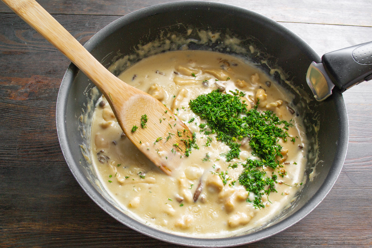 Нагреваем до кипения. Если соус получается чересчур густым, то влейте ещё немного бульона и хорошо перемешайте. Готовим на тихом огне 10 минут, за 2 минуты до готовности добавляем 2 столовые ложки мелко нарезанной зелени укропа.