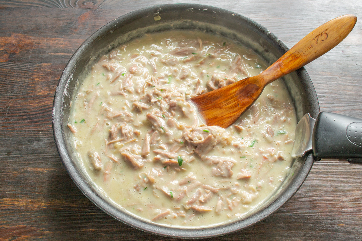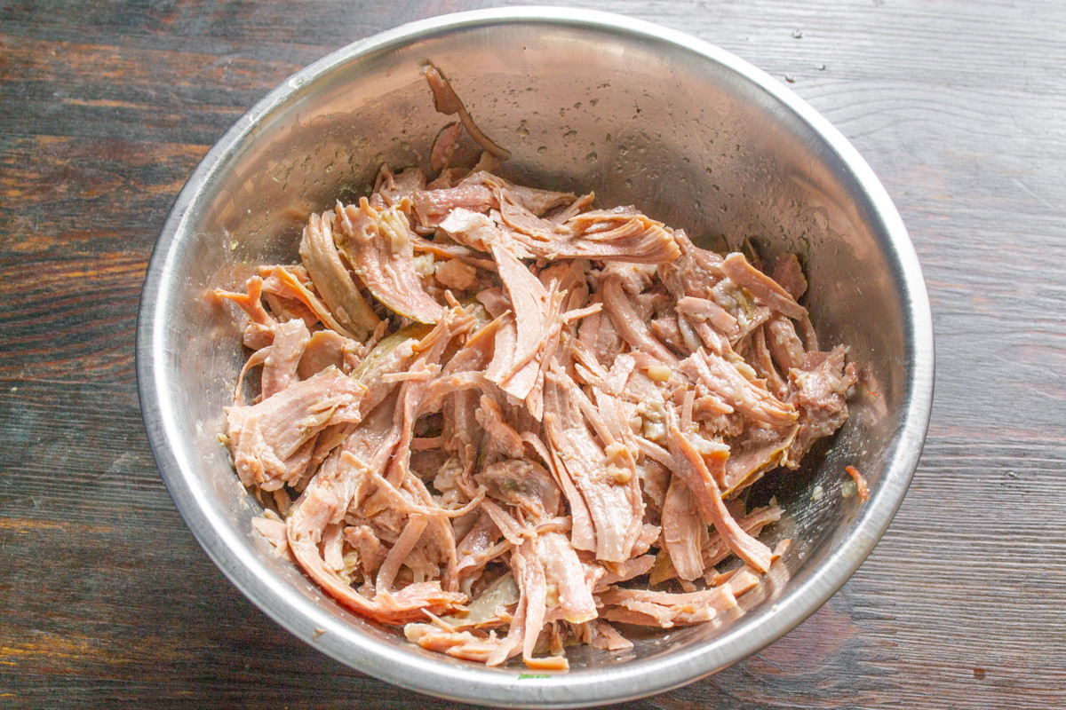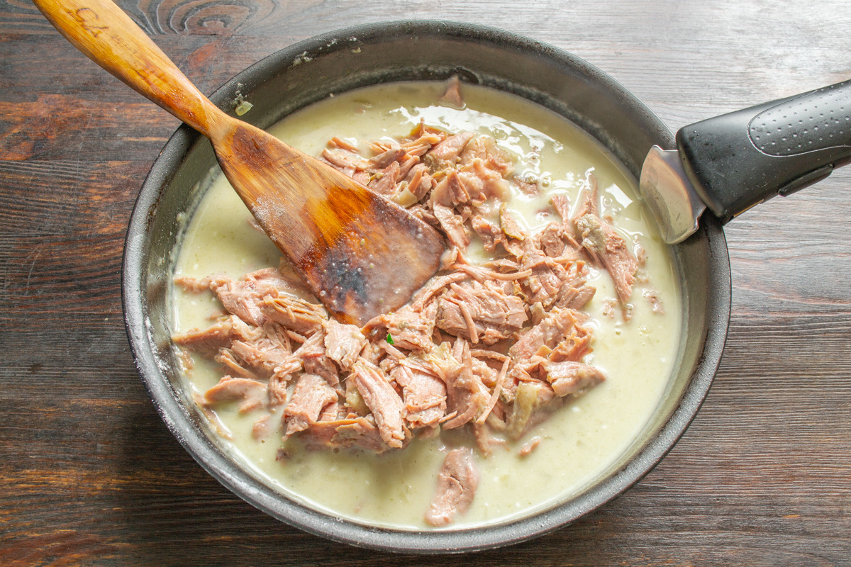 Добавляем отварную говядину или телятину, разобранную на волокна или тонко нарезанную.