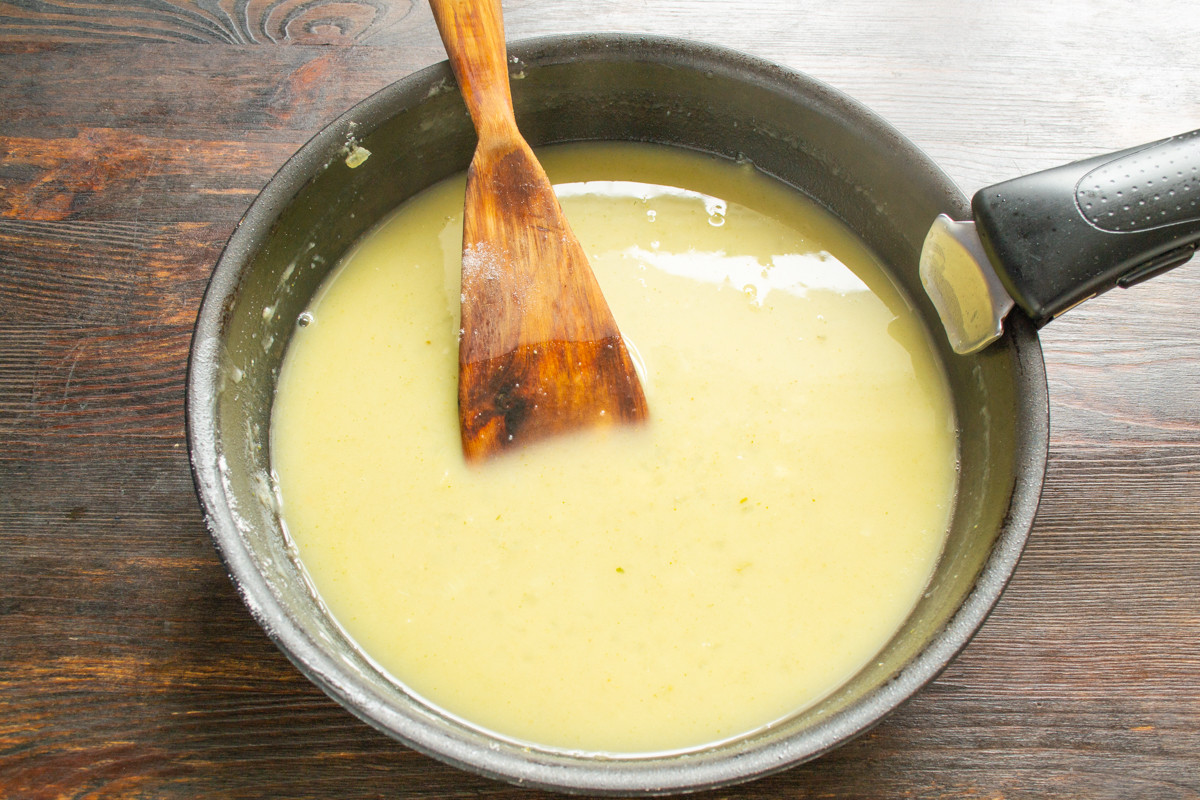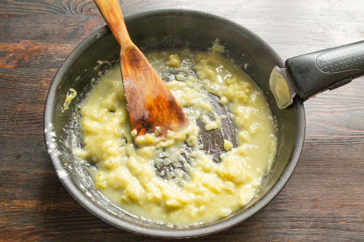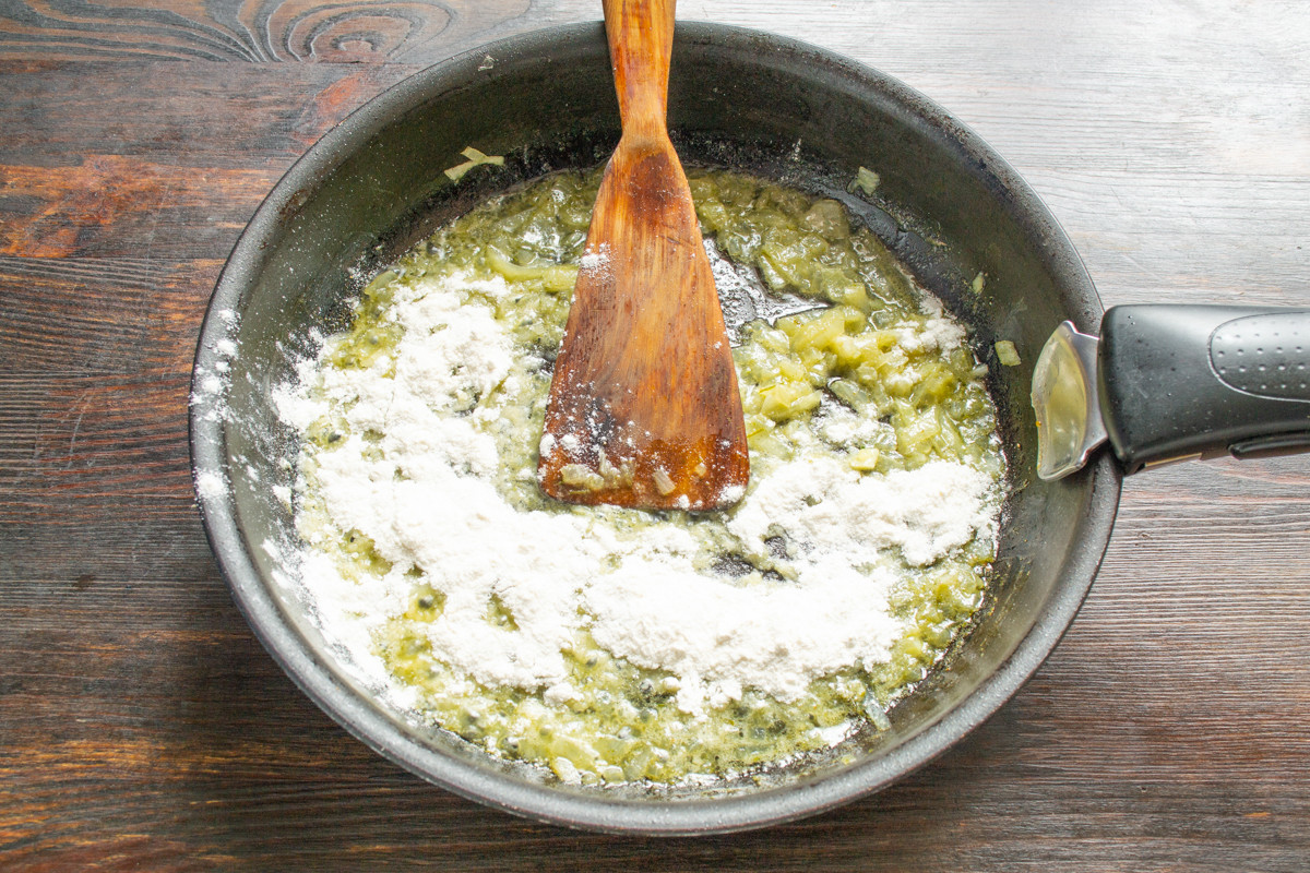 Смешиваем муку с луком, жарим на среднем огне 2-3 минуты. Затем небольшими порциями вливаем мясной или куриный бульон. На этом этапе нагрев уменьшаем до минимального, муку с бульоном растираем лопаткой, чтобы соус густел постепенно.