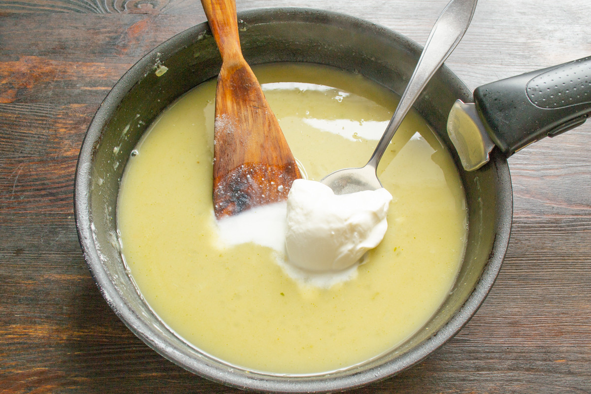 Добавляем сметану, по вкусу солим и перчим молотым черным перцем. Размешиваем соус, на небольшом огне доводим до кипения, кипятим 1-2 минуты и можно собирать блюдо.