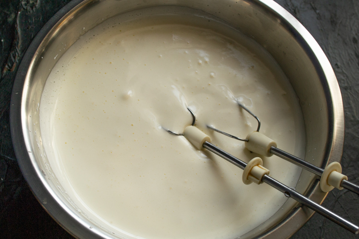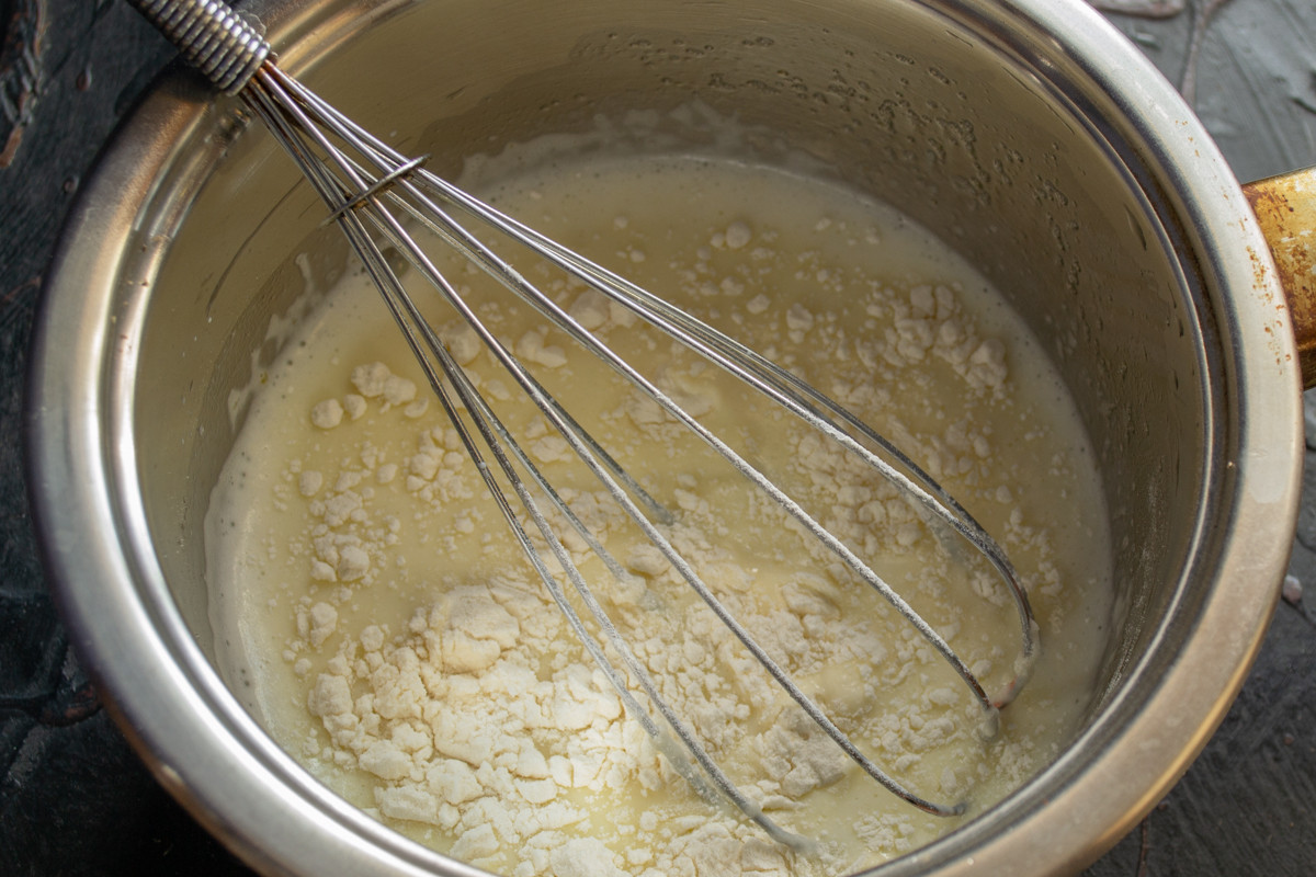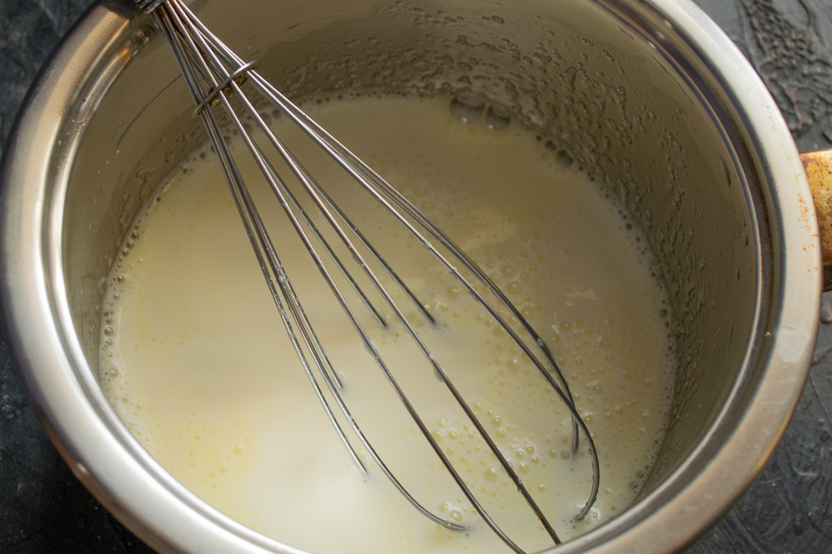 Наливаем молоко или сливки, снова перемешиваем.