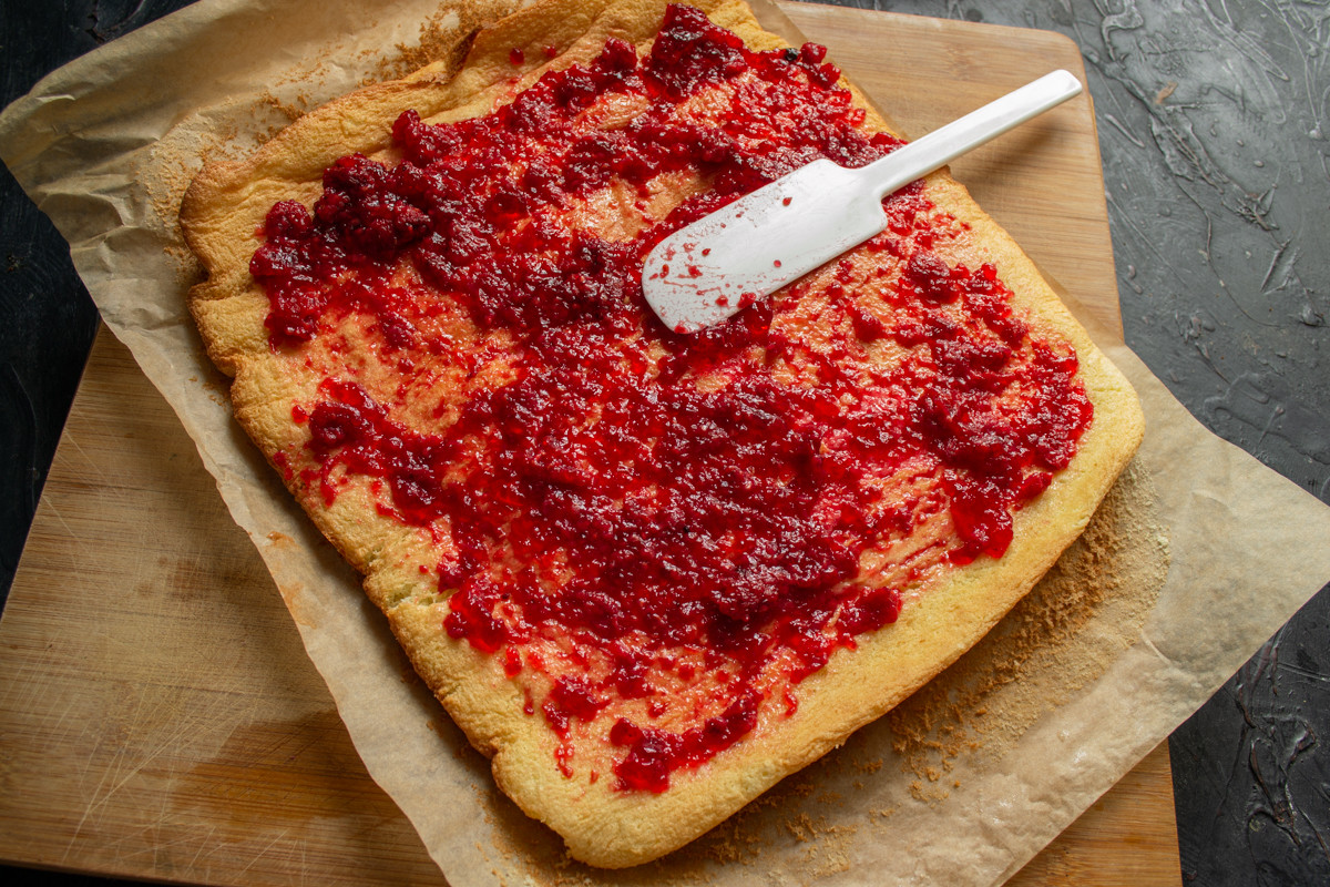 Аккуратно разворачиваем бисквит и смазываем тонким слоем малинового джем по всей поверхности от края до края.
