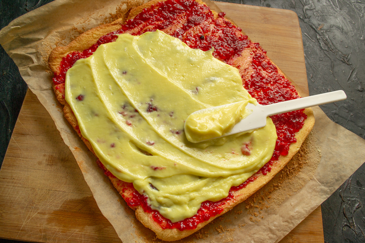 На слой малинового джема выкладываем остывший заварной крем и распределяем его лопаткой, не доходя до края примерно по сантиметру.