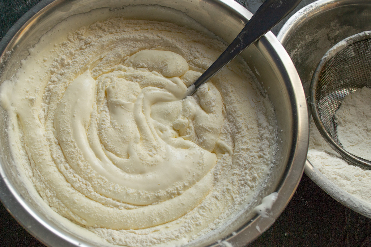 На взбитые яйца просеиваем по столовой ложке пшеничную муку, тут же очень аккуратно и бережно перемешиваем ингредиенты, стараясь не разрушить пышную текстуру теста.