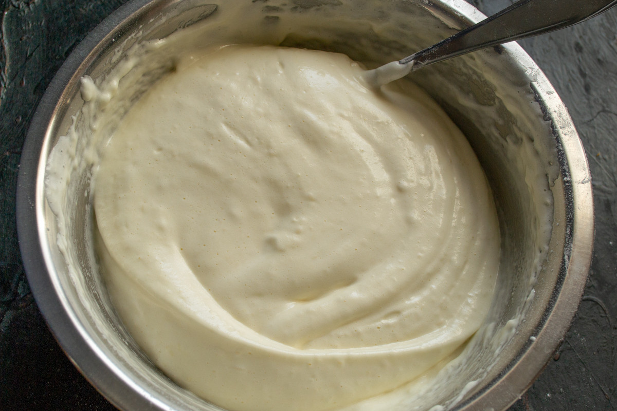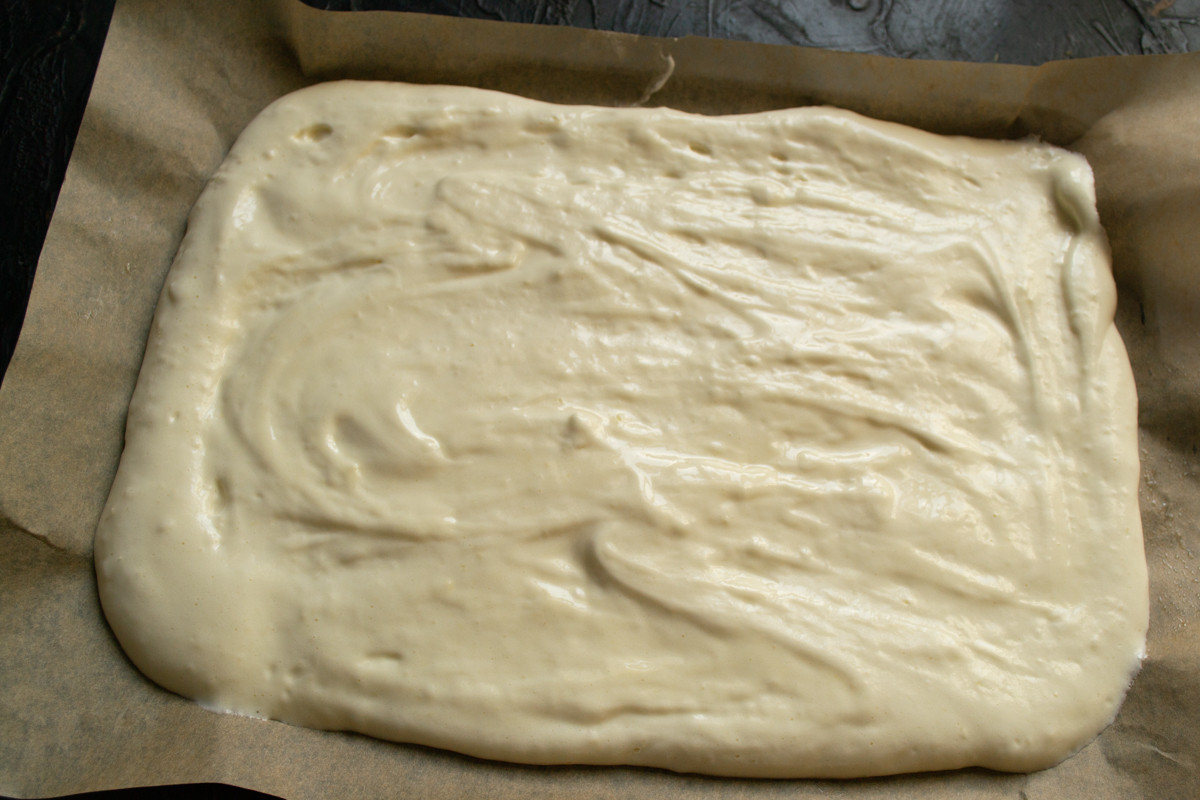 Готовое тесто для рулета пышное, воздушное, его нужно тут же печь.