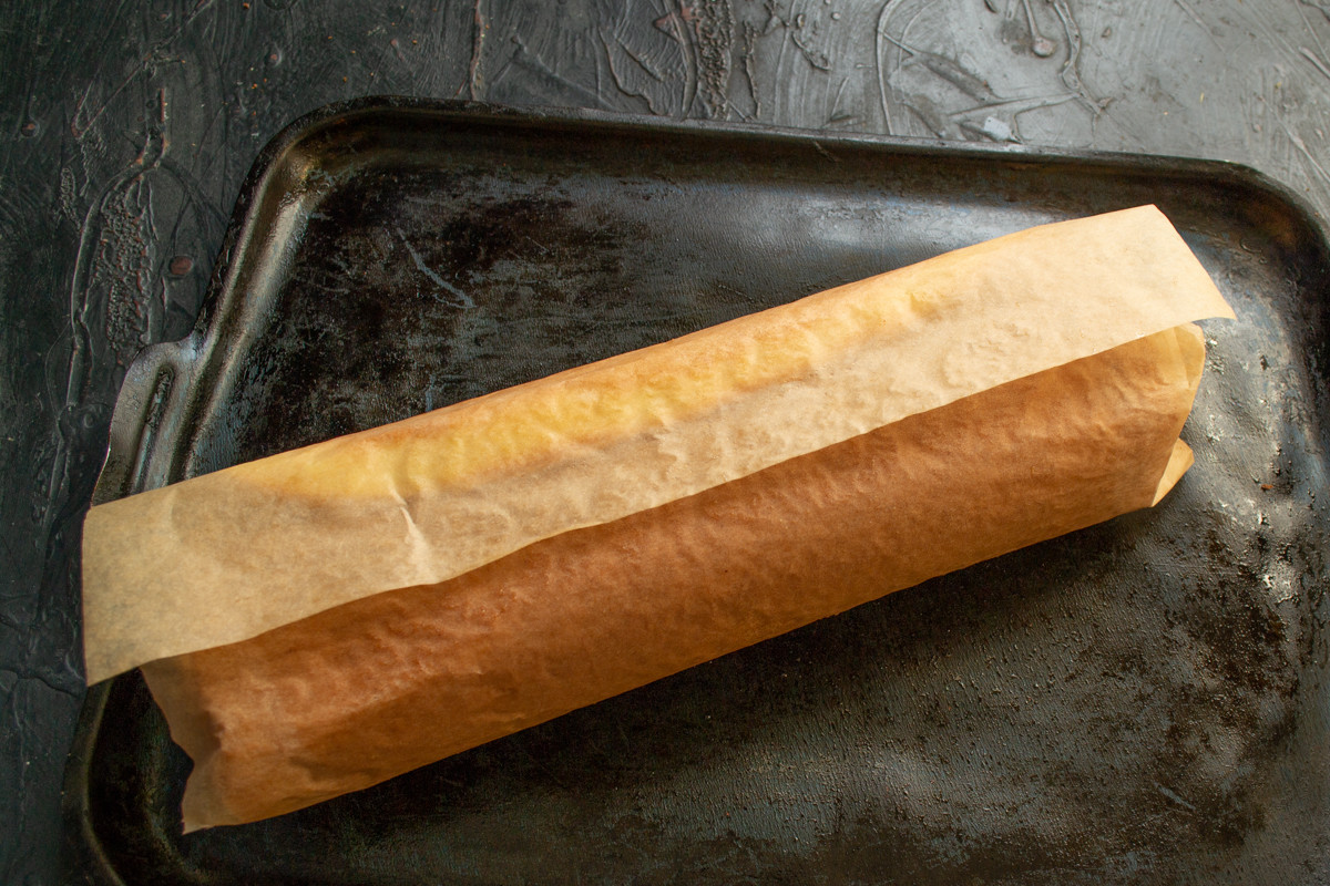 Достаём противень из духового шкафа и тут же сворачиваем рулет вместе с бумагой по узкой стороне. Свернутый рулет можно убрать в холодильник, чтобы ускорить процесс.