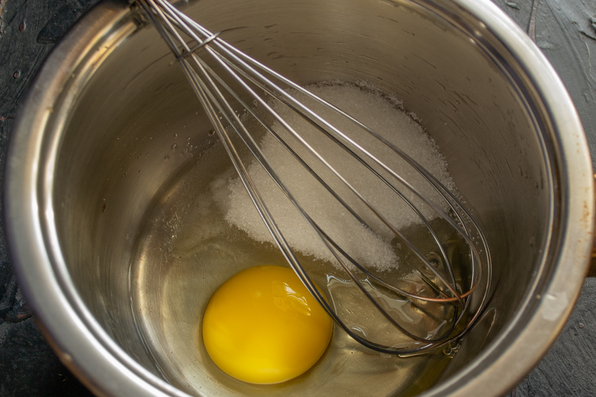 Делаем крем. Разбиваем яйцо в кастрюльку, добавляем щепотку соли, сахар и ванилин. Взбиваем ингредиенты венчиком.