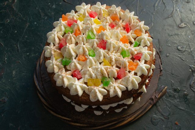 Украшаем торт цукатами, посыпаем какао или корицей и оставляем в холодильнике на 8-10 часов, чтобы влага из крема хорошо пропитала бисквиты. Подаём к кофе или чаю. Приятного аппетита!