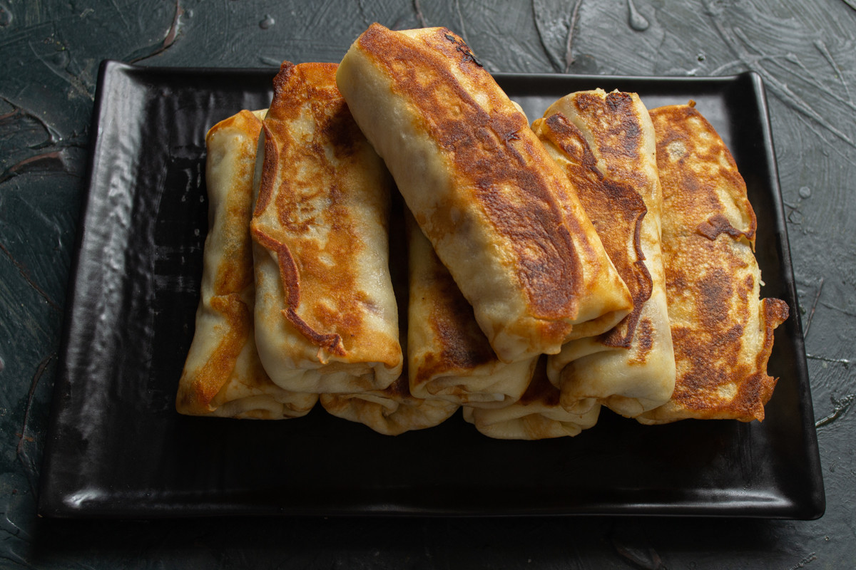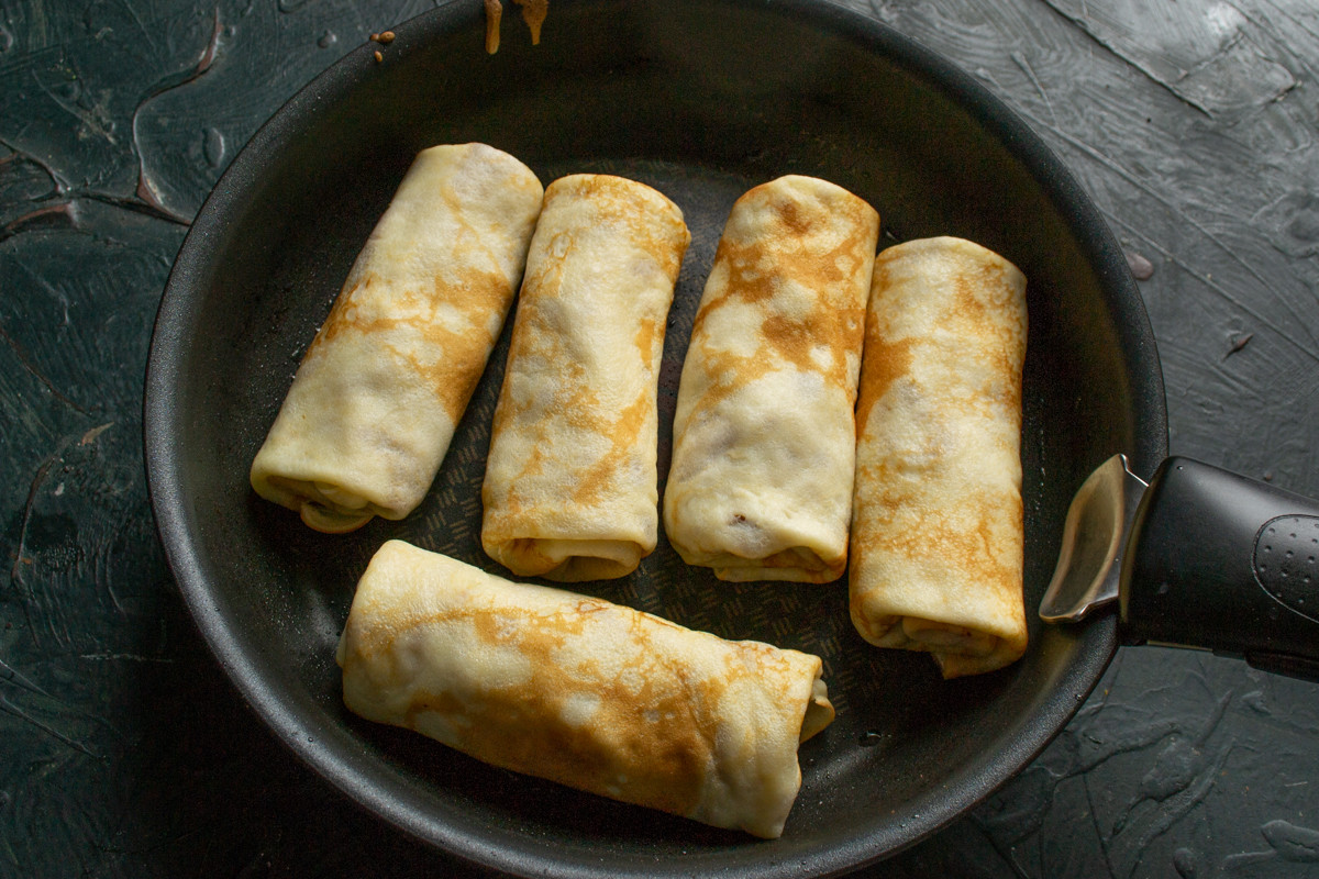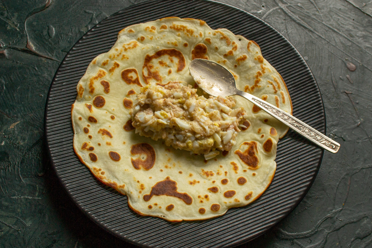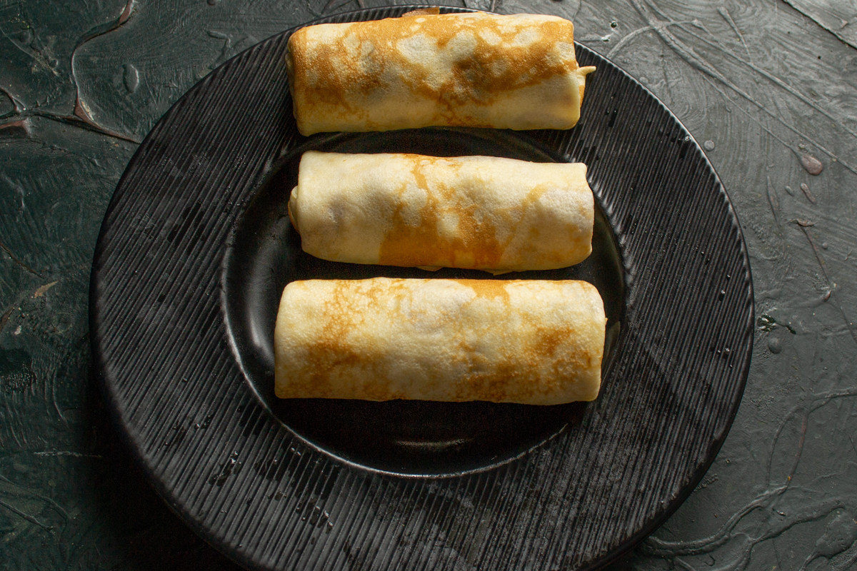 Сворачиваем толстенькие трубочки, таким образом собираем все блины. Из указанного в рецепте количества ингредиентов получится 8-10 штук.
