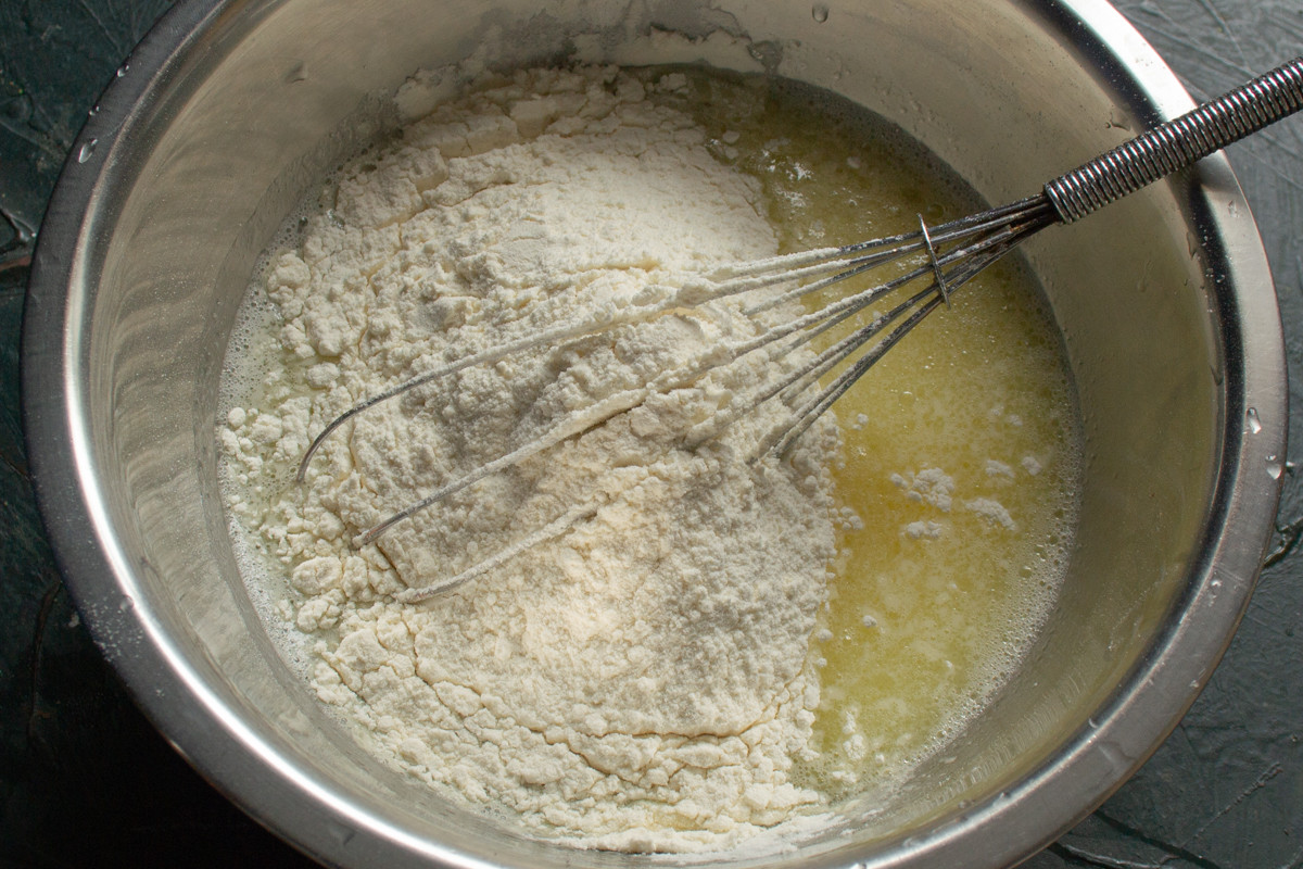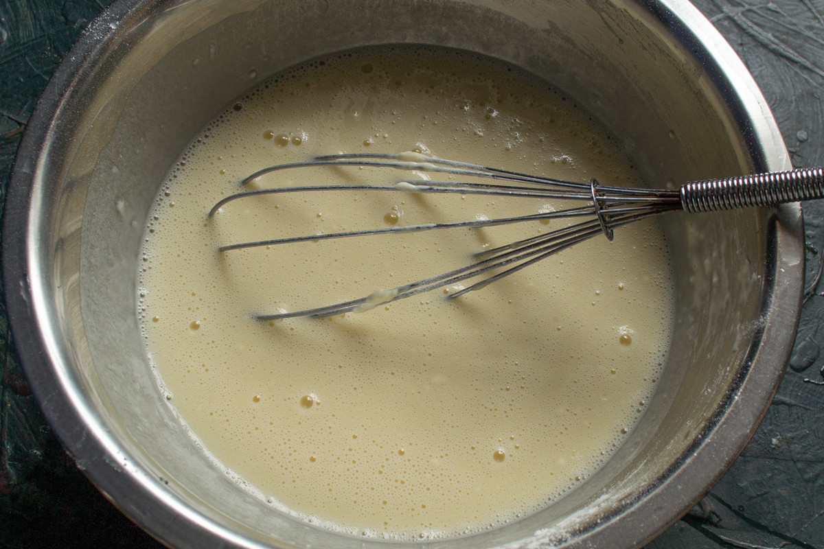 Просеиваем пшеничную муку к жидким ингредиентам, замешиваем тесто. Если в тесте образуются комки муки, то есть два способа от них избавится. Во-первых, можно пробить тесто погружным блендером, во-вторых, процедить через сито, и протереть ложкой комочки.