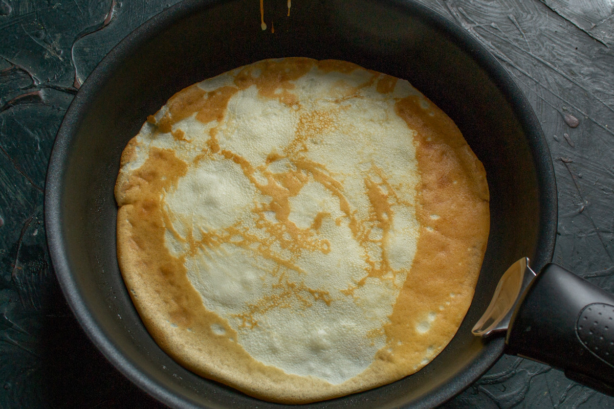 Разогреваем сковороду с толстым дном (размер 25-30 см). Разогретую сковородку смазываем тонким слоем растительного масла или жира. Чтобы слой масла было тонким обмакните в масло половинку сырого картофеля или используйте силиконовую кисточку. Наливаем на край сковороды примерно 40 г теста. Наклоняем и поворачиваем, чтобы тесто растеклось ровным слоем. Жарим блин на сильном огне до светло золотистого цвета с каждой стороны.