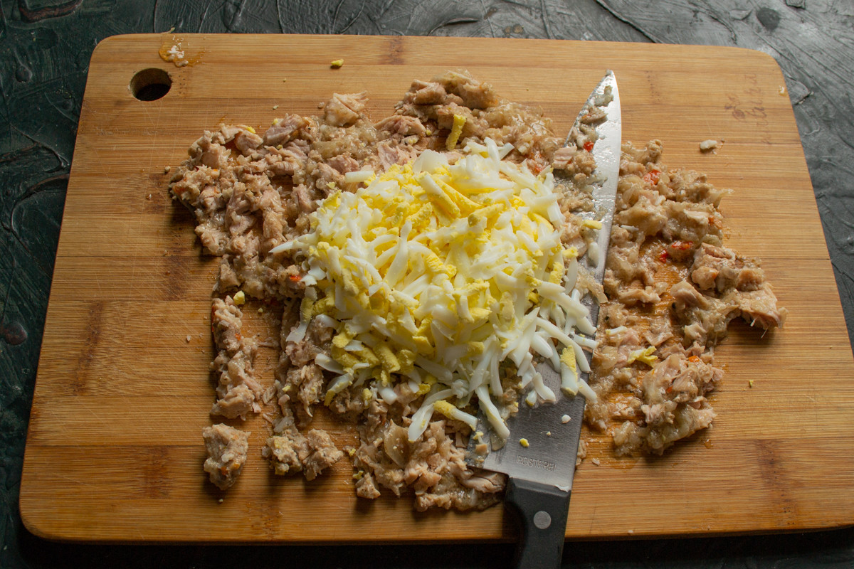 Сваренные вкрутую куриные яйца измельчаем ножом или натираем на тёрке. Добавляем яйца к тушенке, по вкусу солим, перчим.