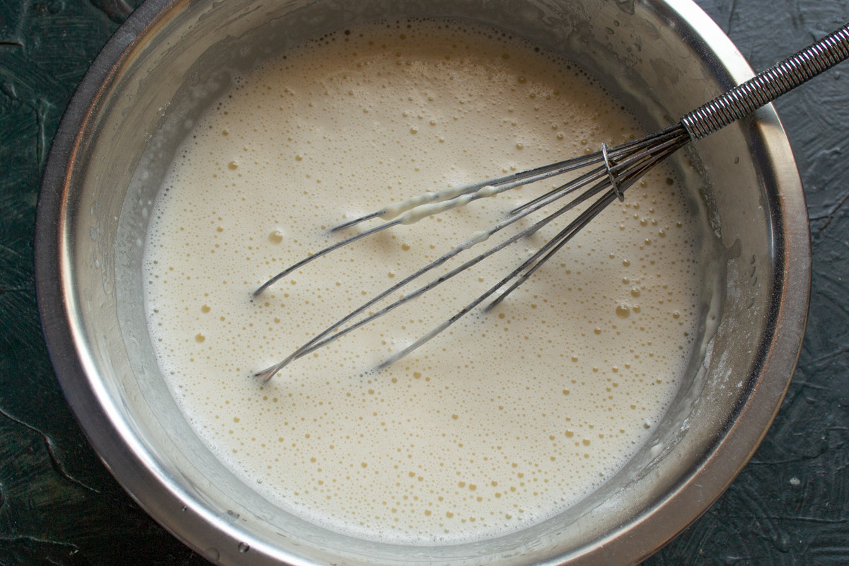 К жидким ингредиентам добавляем пшеничную муку, замешиваем тесто. Чтобы тесто получилось гладким, без комков, его лучше смешать блендером или миксером. Если замешивать вручную, то рекомендую добавлять к муке жидкие ингредиенты небольшими порциями.