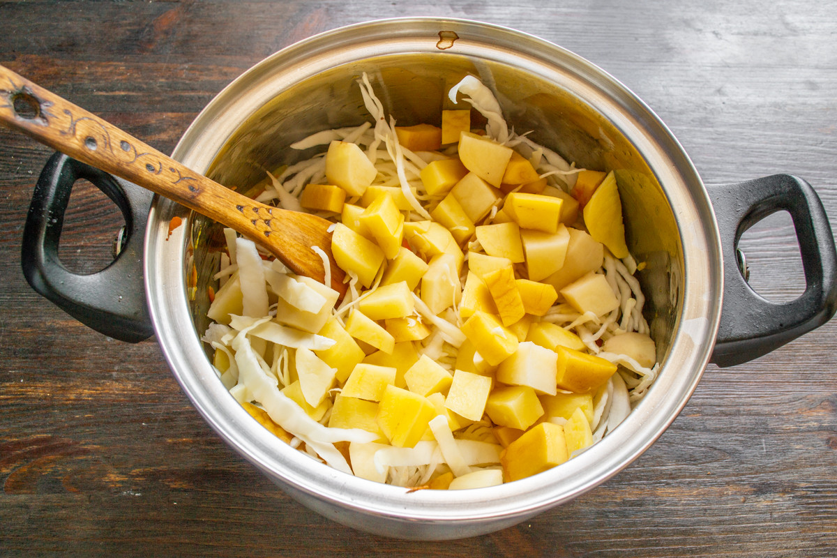 Картофелины очищаем от кожуры, нарезаем кубиками. Отправляем нарезанный картофель в кастрюлю следом за капустой.
