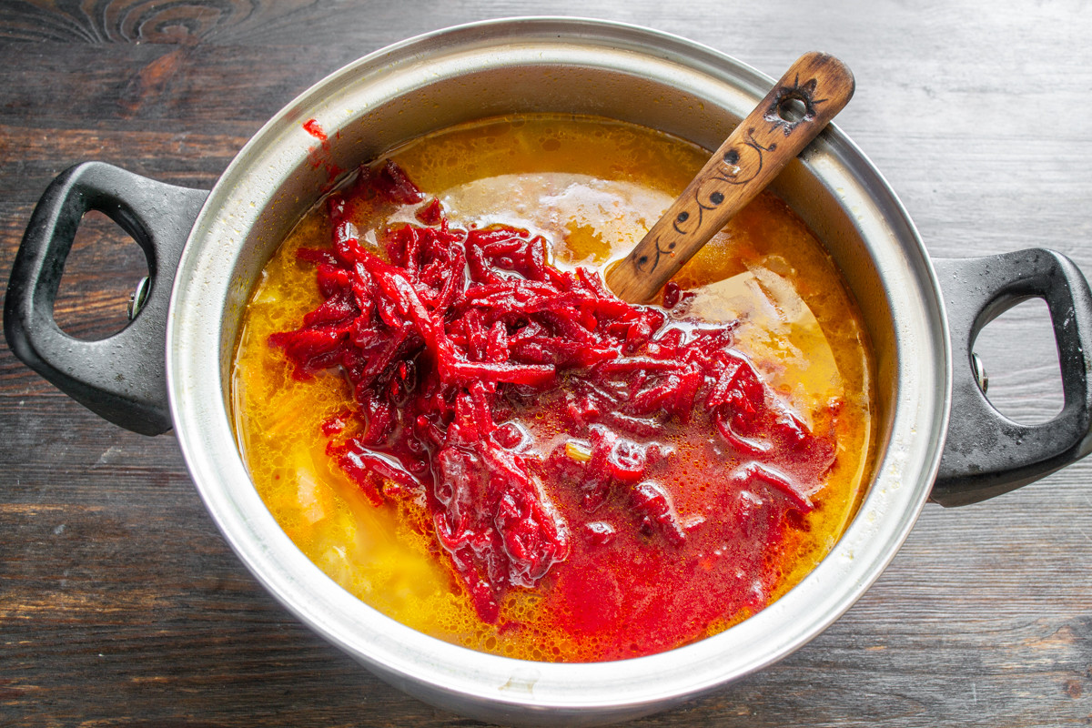 Когда овощи сварятся, выкладываем в кастрюлю тушеную в томатном соке свеклу.