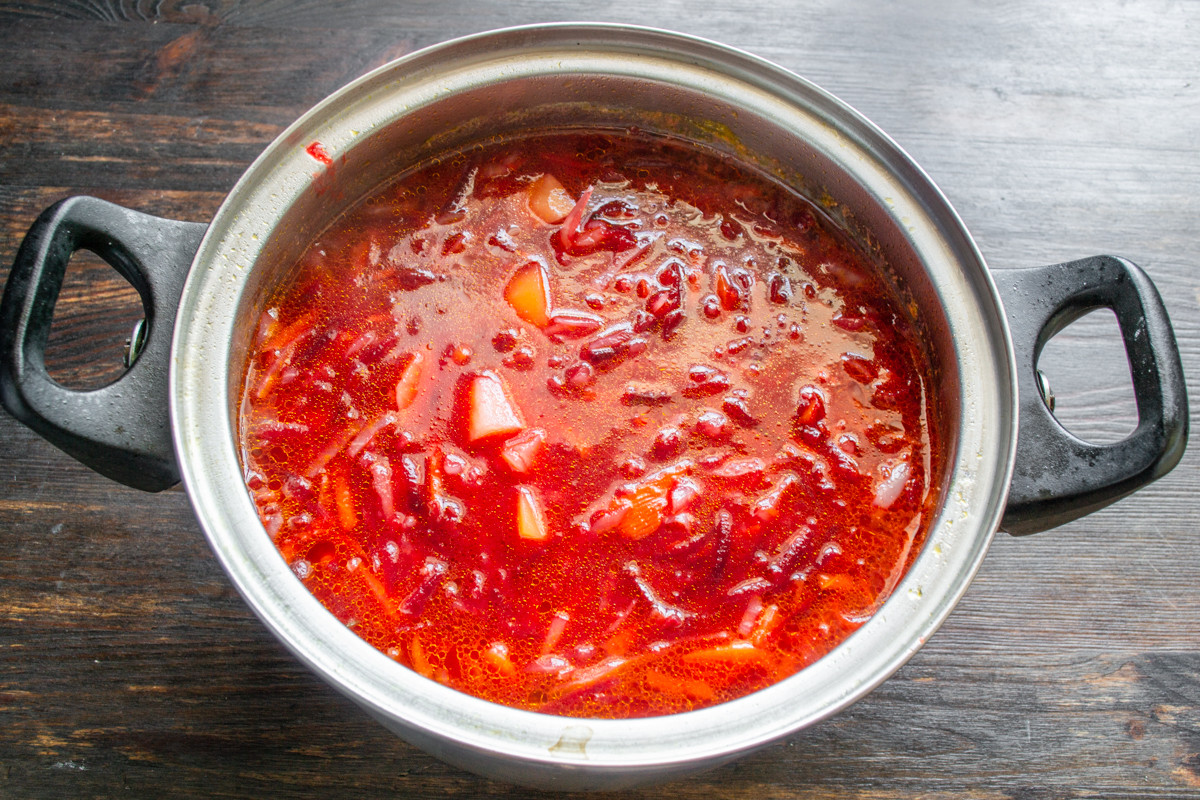 В самом конце готовки солим борщ по своему вкусу, нагреваем почти до кипения, но не кипятим. Снимаем кастрюлю с огня. Если кипятить суп со свеклой, то красивый красный цвет потускнеет, станет буро-красным или почти коричневым.