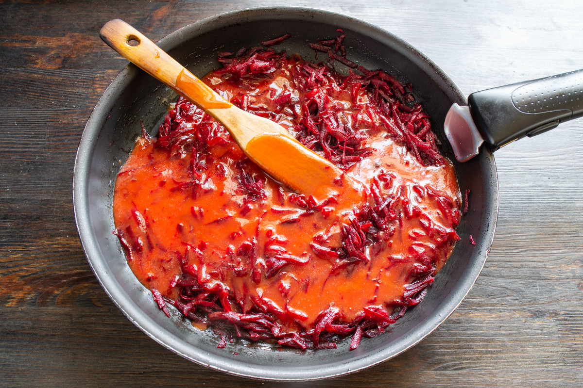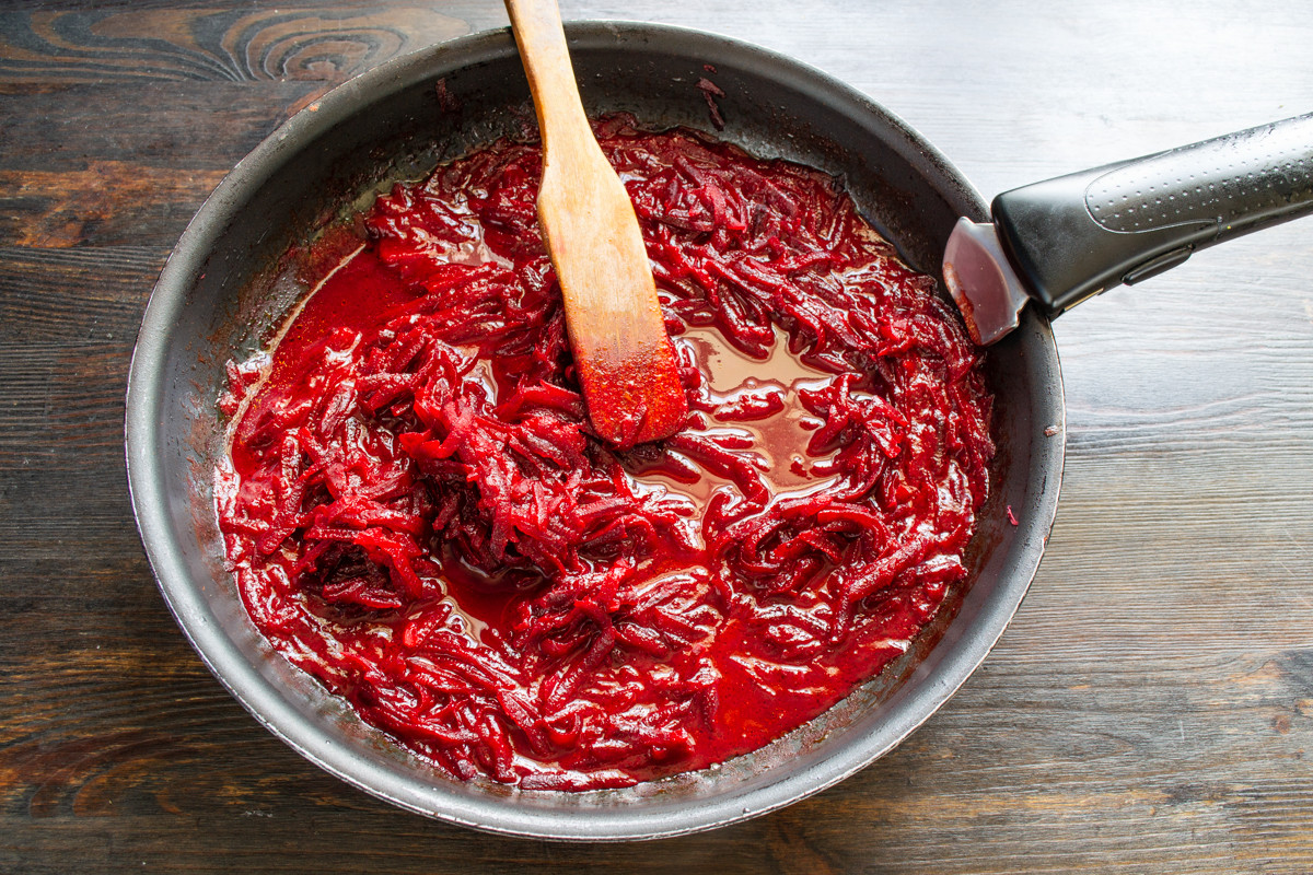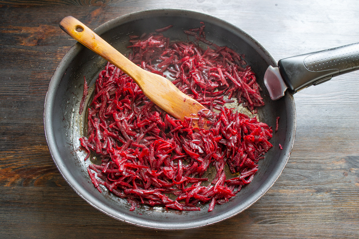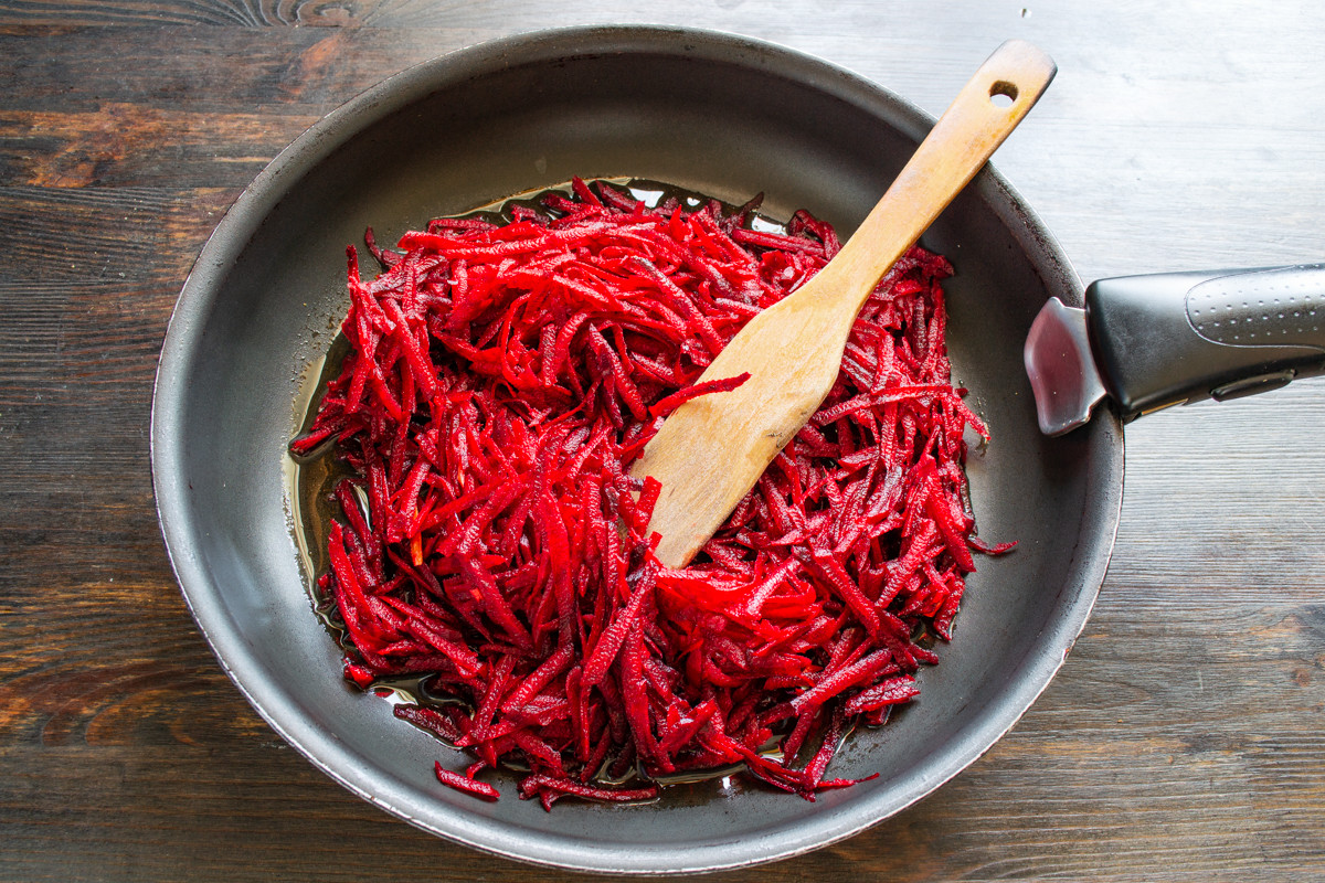 Обжариваем свеклу на среднем огне 10 минут, помешиваем, чтобы не пригорала.