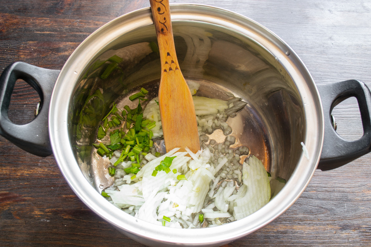 Наливаем в кастрюлю с толстым дном столовую ложку растительного масла. Нарезаем мелкими кубиками головку репчатого лука. Мелко режем стебли сельдерея или небольшой пучок стеблей петрушки. Бросаем нарезанные овощи в кастрюлю. Обжариваем на небольшом огне 5-7 минут, пока лук не станет мягким.