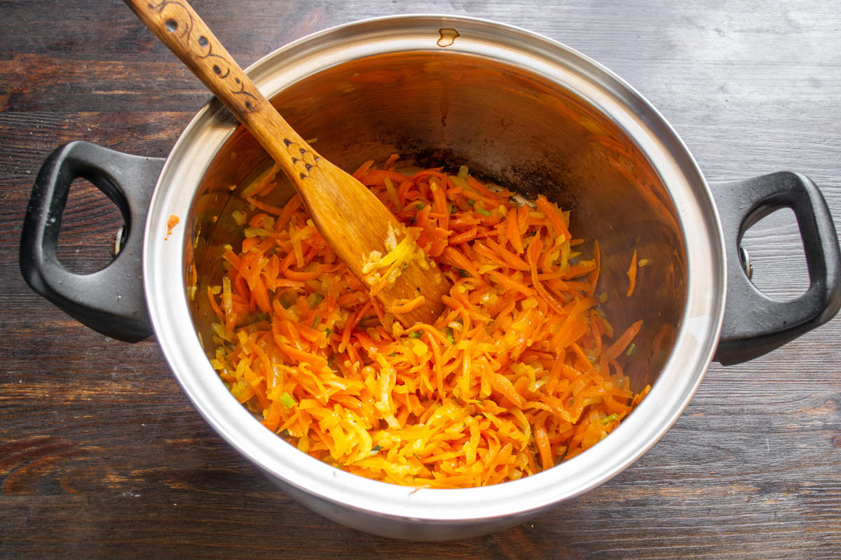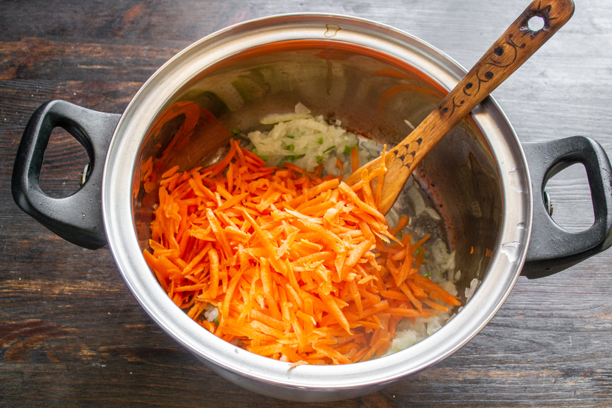 Морковь скоблим, натираем на крупной терке. Бросаем тертую морковь в кастрюлю.