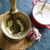 Чистим чеснок: давим дольки ножом, снимаем шелуху. Раздавленный чеснок толчем в ступе с щепоткой соли.