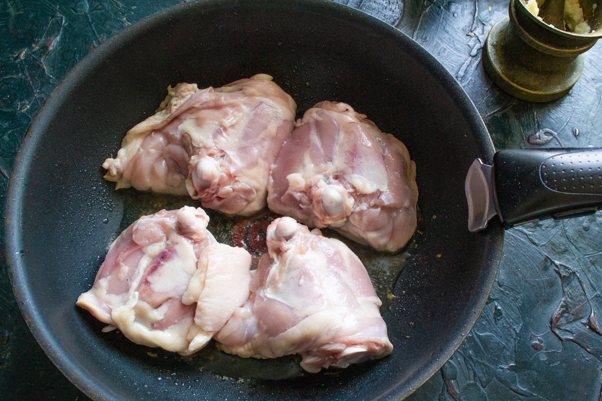 Разрезаем курицу на порционные куски, промываем, обсушиваем бумажным полотенцем. Характерная особенность чахохбили так называемая сухая обжарка мяса. Однако это не значит, что жира в сковороде не будет. Из куриной кожи вытапливается достаточное количество жира, поэтому и нужно обсушить кусочки, чтобы не образовывалось множество брызг при обжарке. Подготовленную курицу кладем на раскаленную сковороду кожей вниз, жарим на сильном огне, крышкой не накрываем!