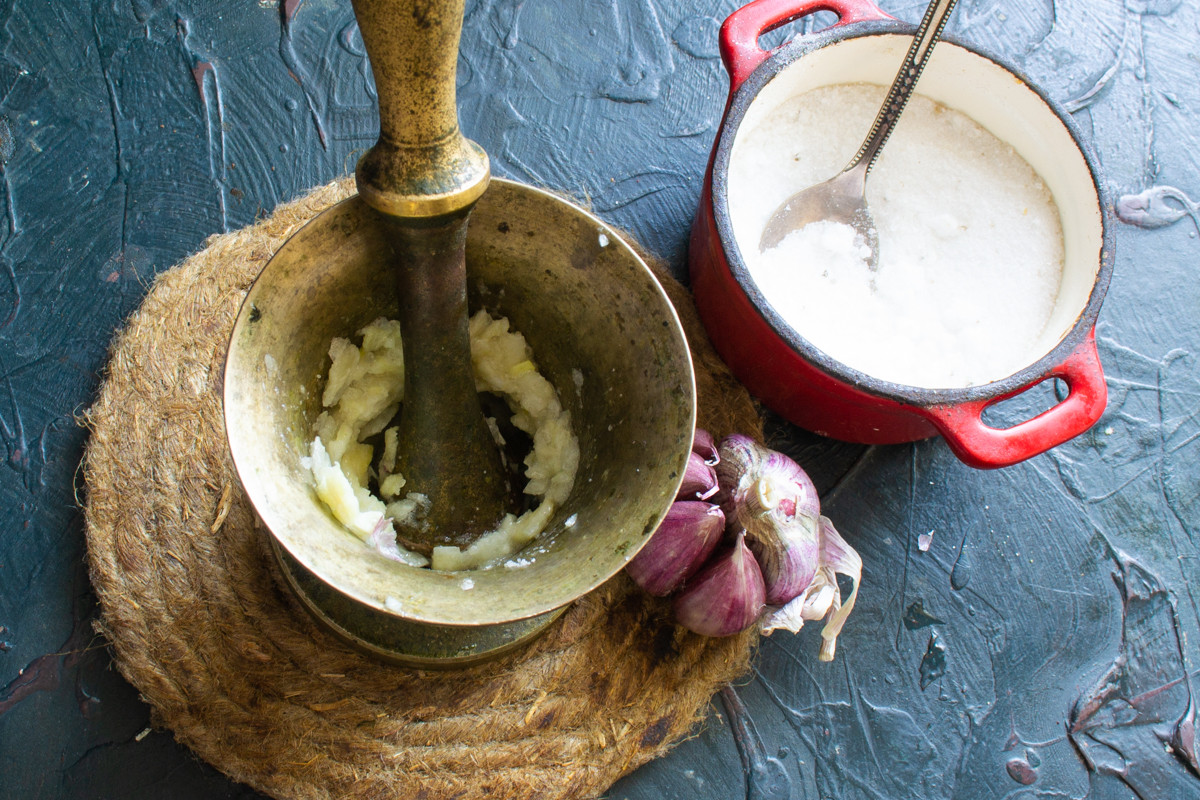 Чистим чеснок: давим дольки ножом, снимаем шелуху. Раздавленный чеснок толчем в ступе с щепоткой соли.