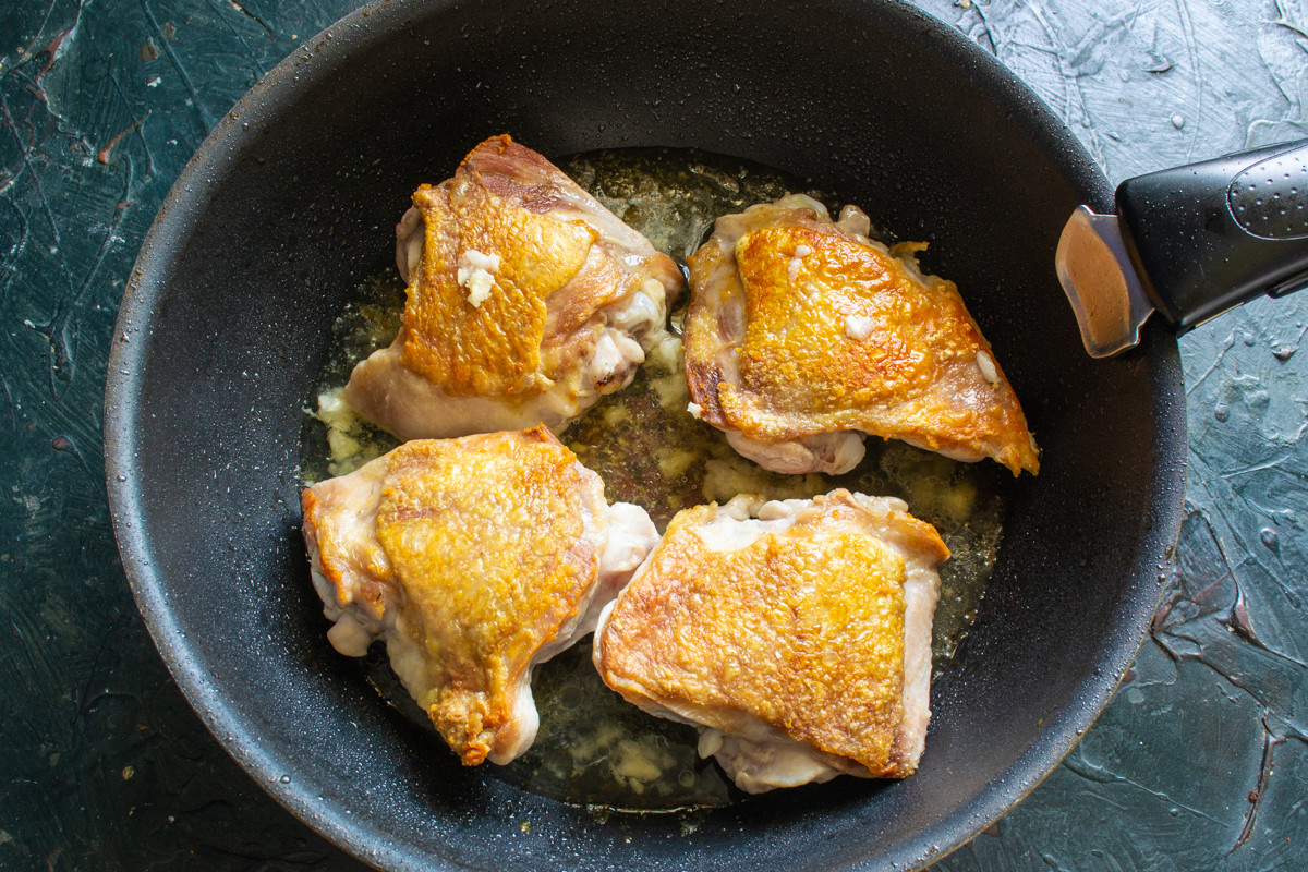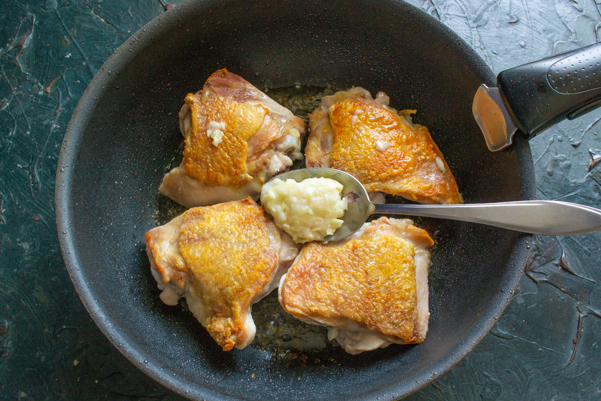 Жарим курочку до очень румяного, золотистого цвета, переворачиваем. Обжариваем с другой стороны ещё несколько минут. Добавляем толченый чеснок в сковороду. Насыпаем уцхо-сунели и хмели-сунели.