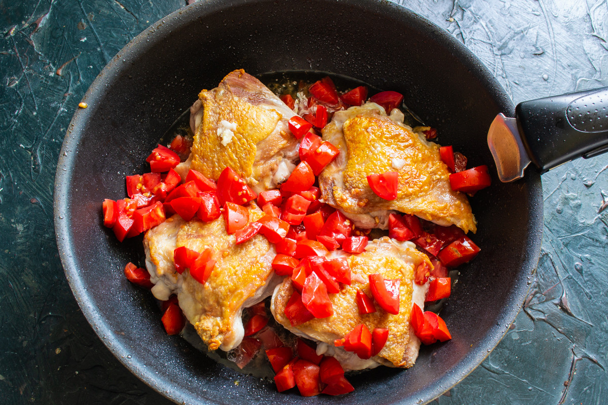 Спелые красные помидоры заливаем кипящей водой, оставляем на пару минут. Охлаждаем помидоры ледяной водой, снимаем кожицу, вырезаем плодоножку. Нарезаем помидоры кубиками, добавляем к курице. Можно использовать в рецепте резанные консервированные помидоры в собственном соку, понадобится около стакана консервированных томатов вместе с соком.