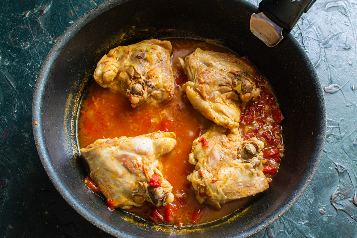 Прикрываем сковороду крышкой или фольгой. Готовим на тихом огне 45-50 минут. В конце готовки советую снять крышку и немного выпарить соус, чтобы он загустел.