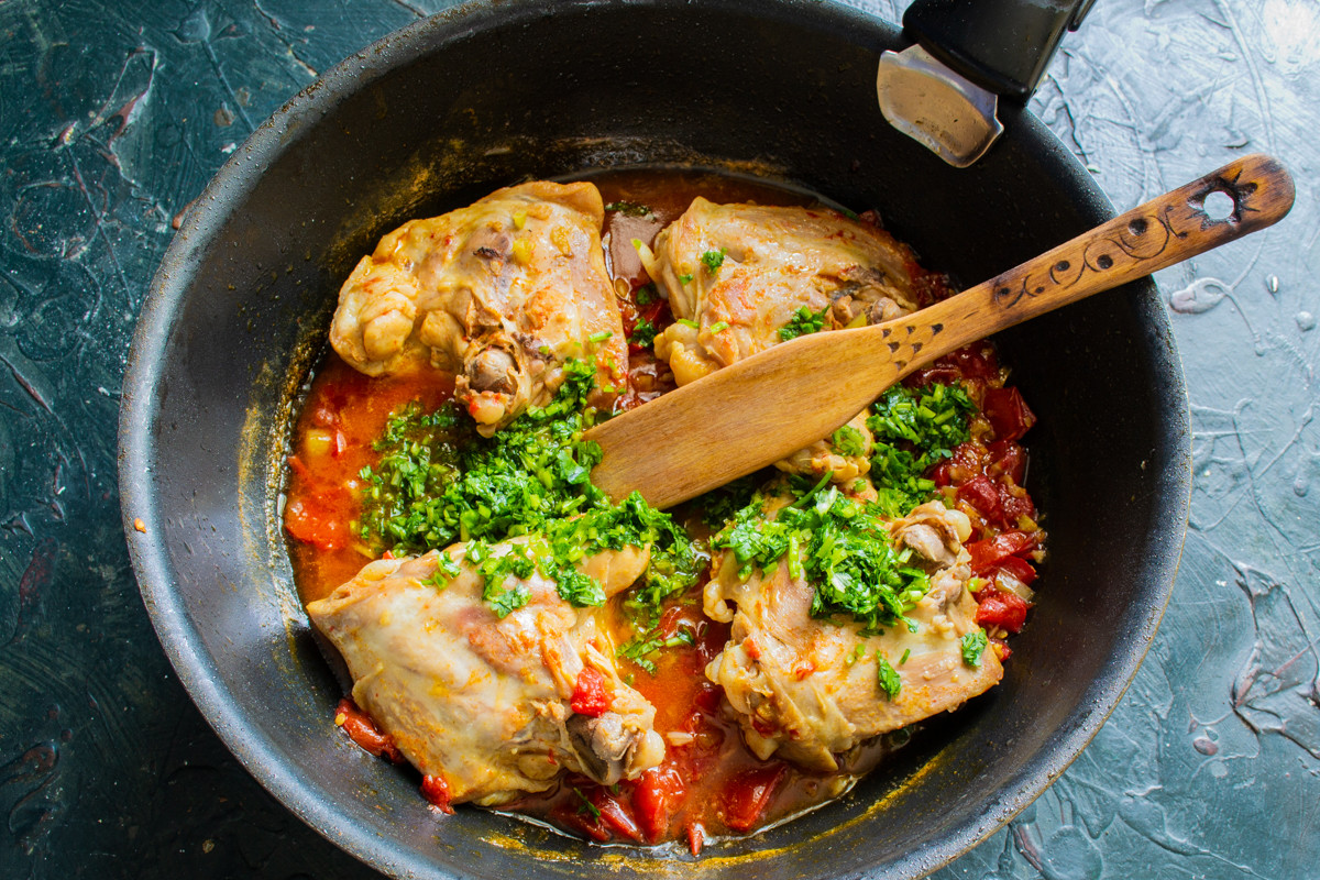 Хорошо перемешиваем и чахохбили по-домашнему готово.