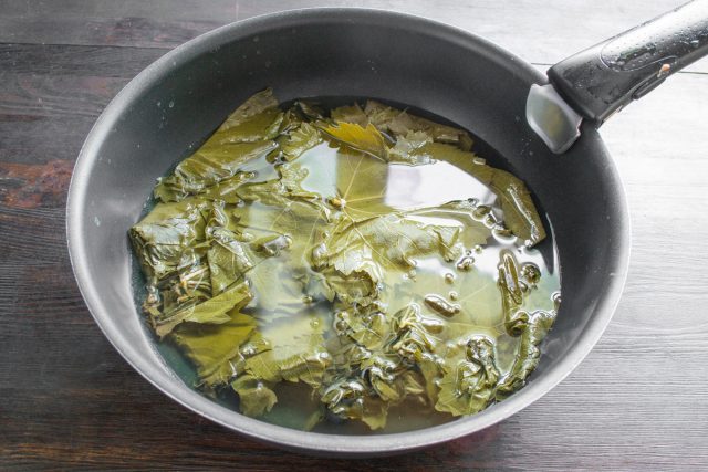 Вы можете заворачивать начинку как в свежие, так и в консервированные виноградные листья. В большую кастрюлю наливаем воду, нагреваем до кипения. Кладём консервированные листья, отвариваем 3 минуты, сливаем воду.