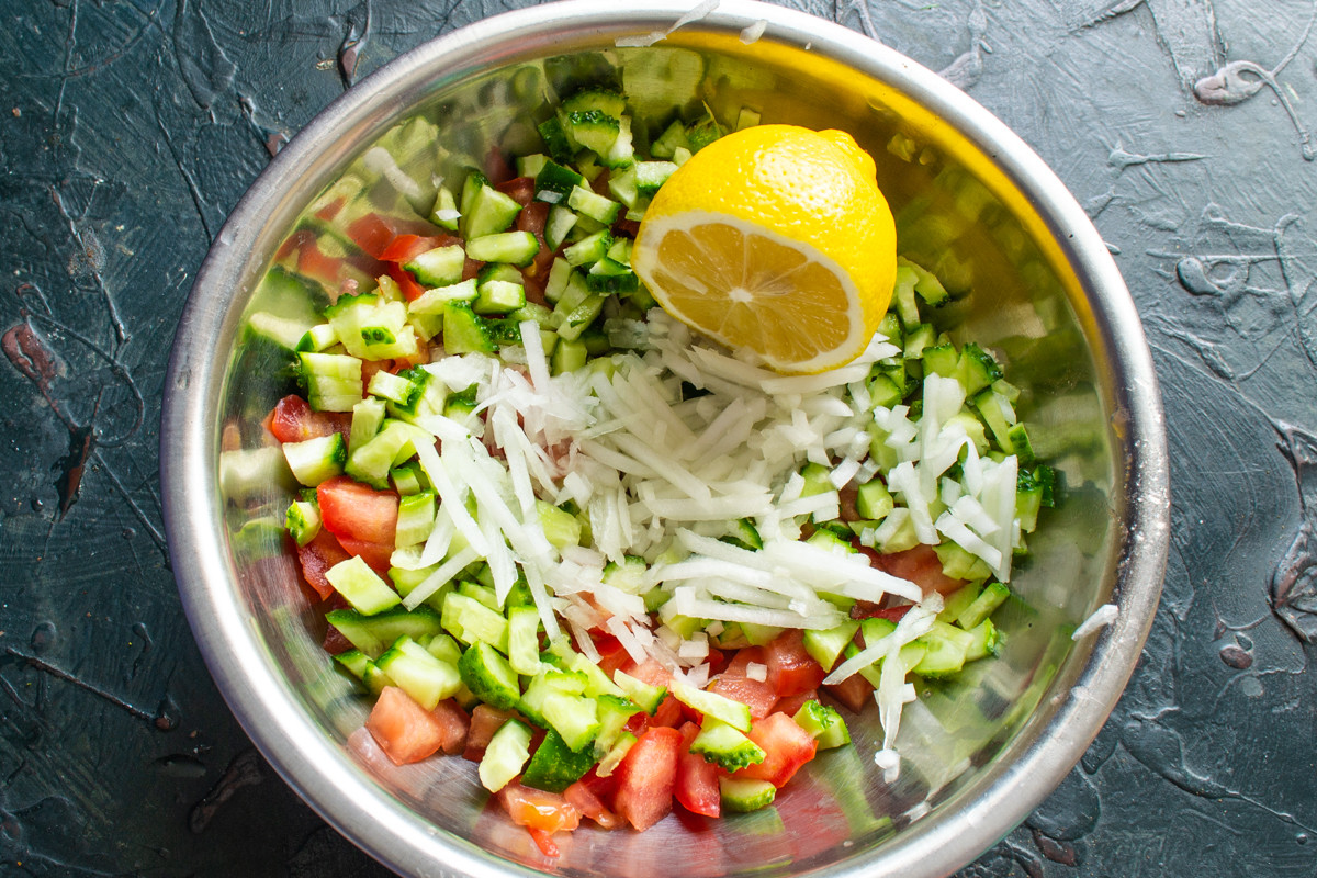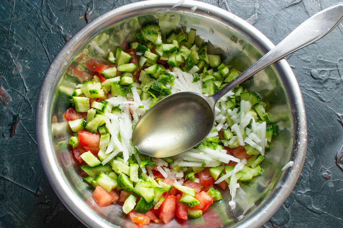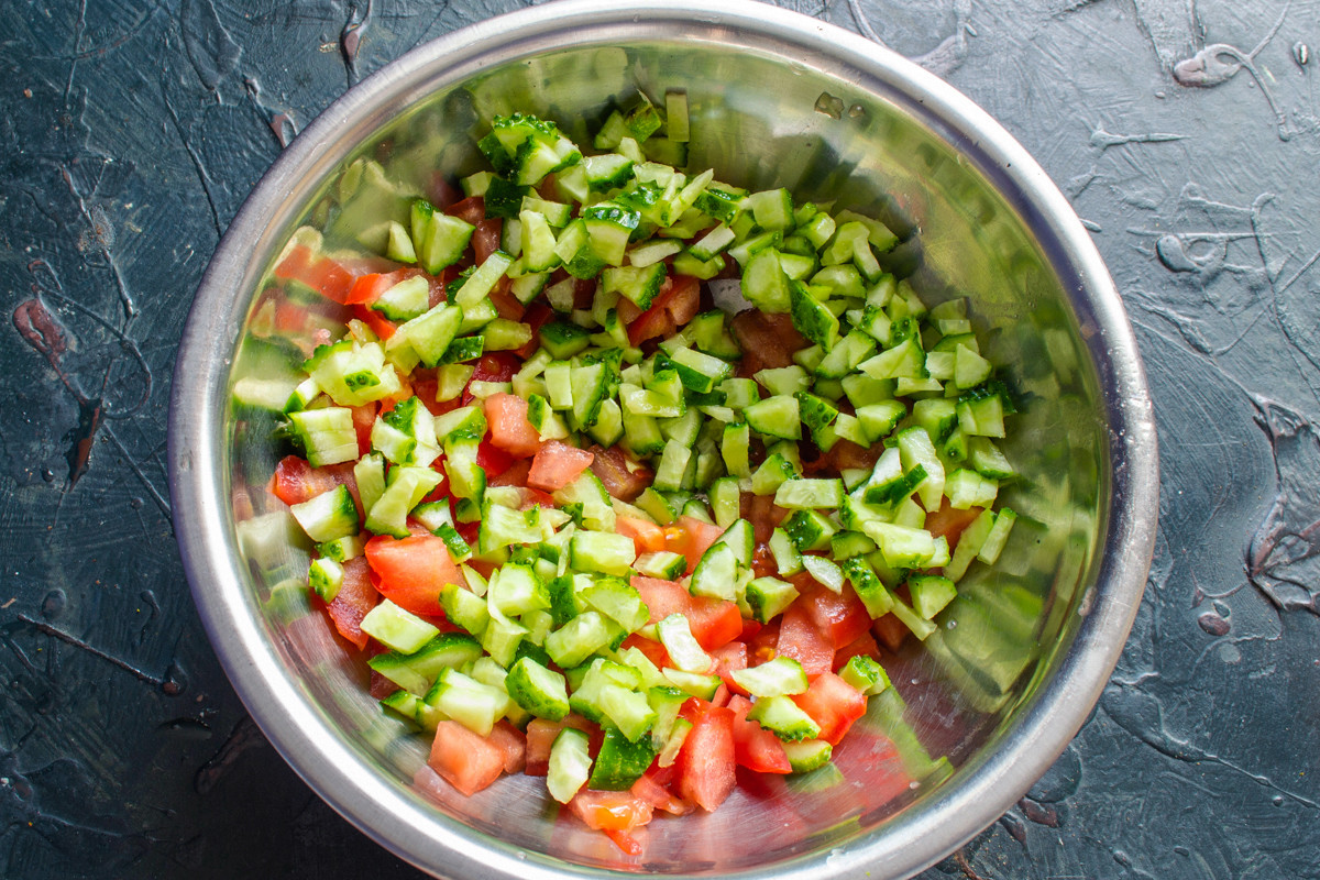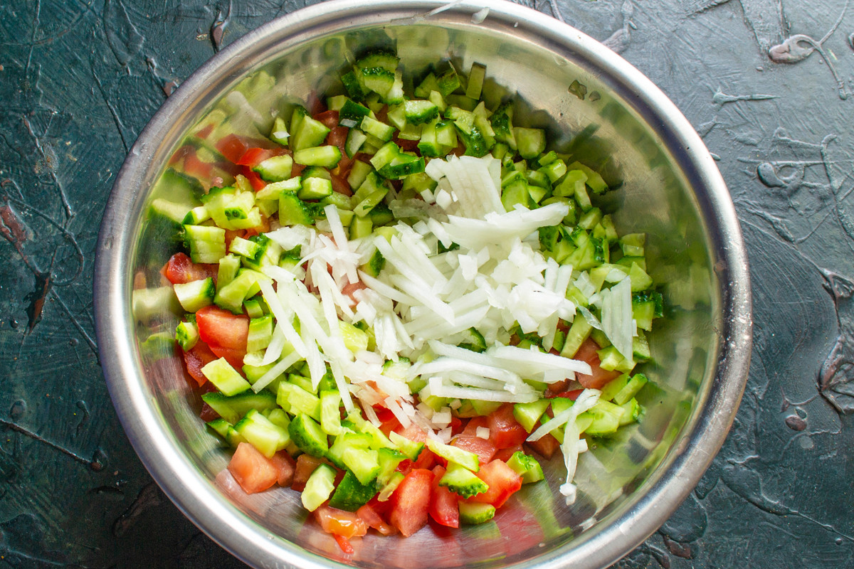Очень мелко режем сладкую луковицу. Добавляем лук к помидорам и огурцам.