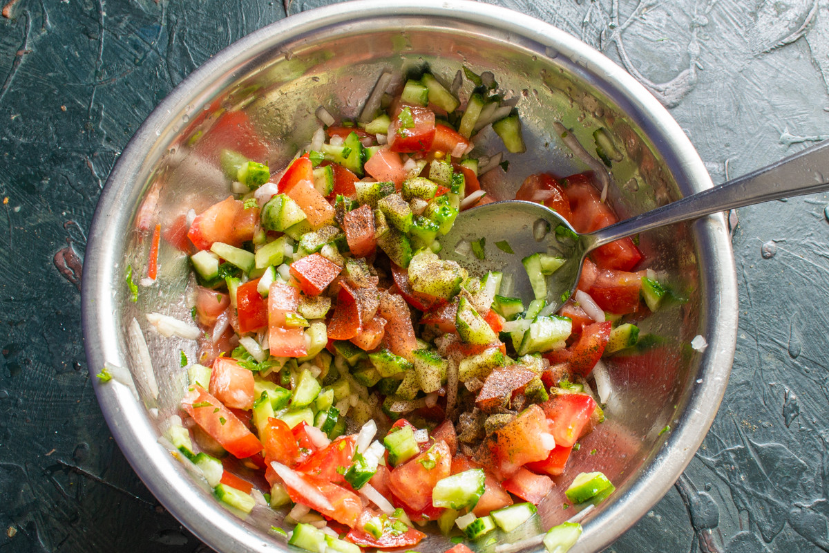 Готовим сальсу. Нарезаем маленькими кубиками очищенные от кожицы помидоры и свежие огурцы.