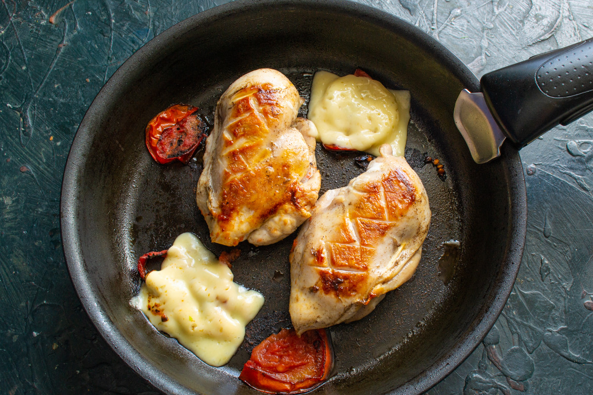 Фаршированное куриное филе поджаривается за 7-8 минут. Когда мясо готово, кладём на ломтики помидоров нарезанный сыр – на горячей сковороде сыр моментально растает. Это станет приятным дополнением к нашему блюду.