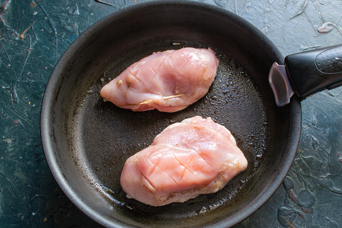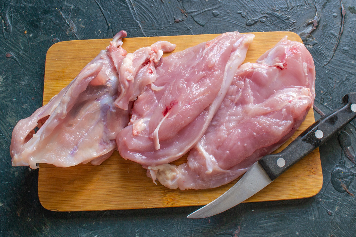 С куриной грудки снимаем кожу. Разрезаем филе вдоль килевой кости. Аккуратно отделяем мясо от каркаса грудки. Собирайте каркасы в морозилке, со временем получится неплохой набор для приготовления куриного бульона.