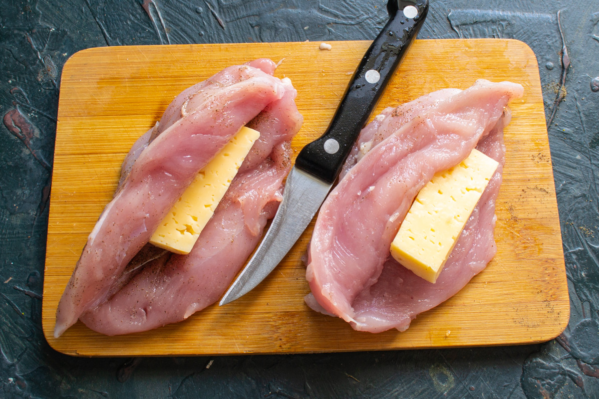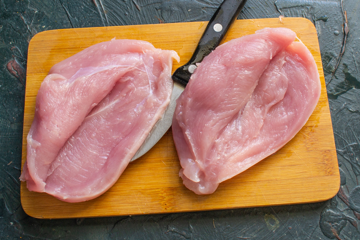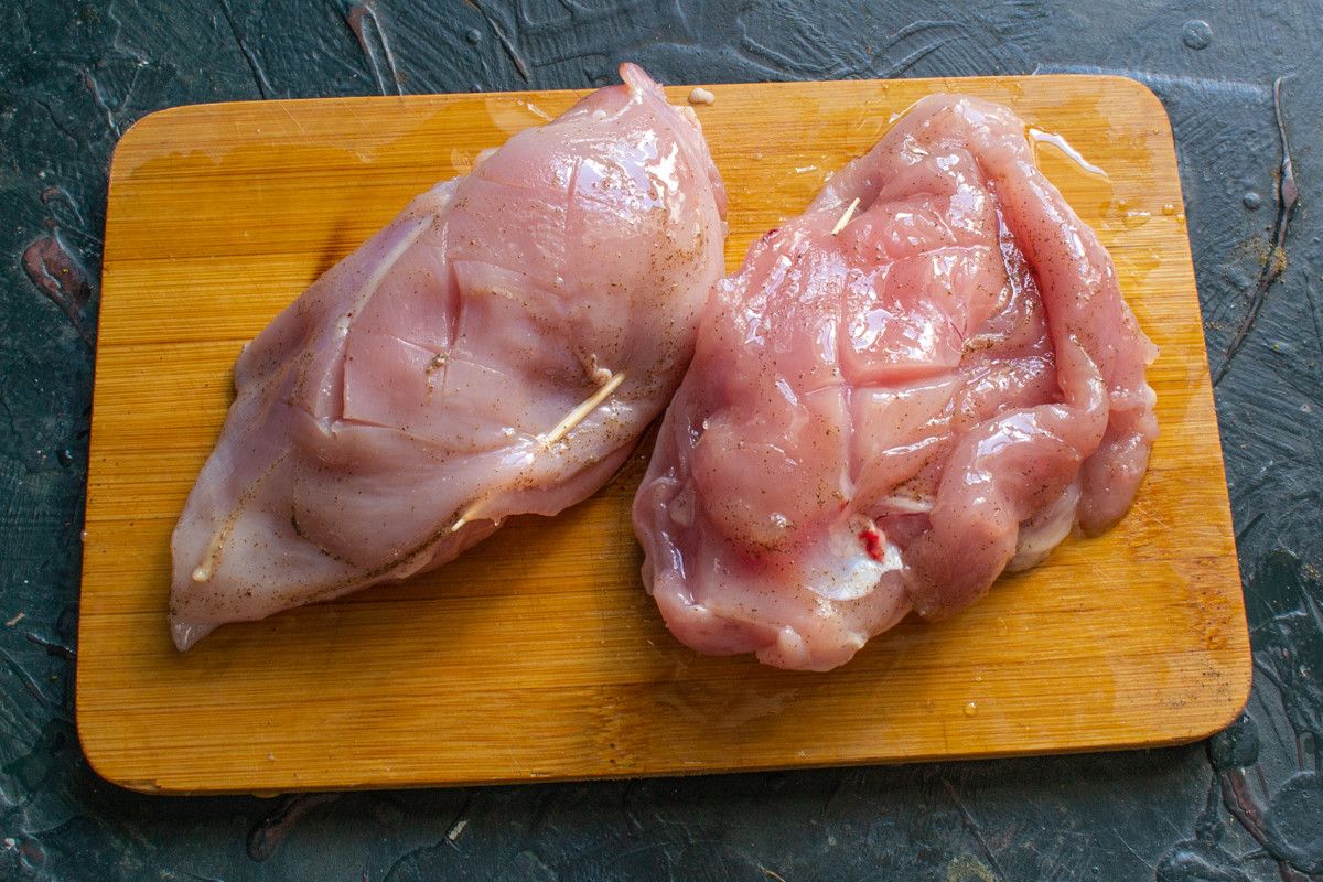 Прорезаем куриное филе с одного края, затем пальцами расширяем углубление. Делаем такой же кармашек во втором филе.