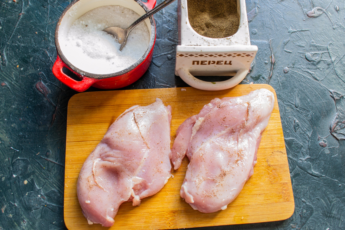 Посыпаем мясо солью и молотым черным перцем. Втираем приправы в курицу с двух сторон и в кармашках.