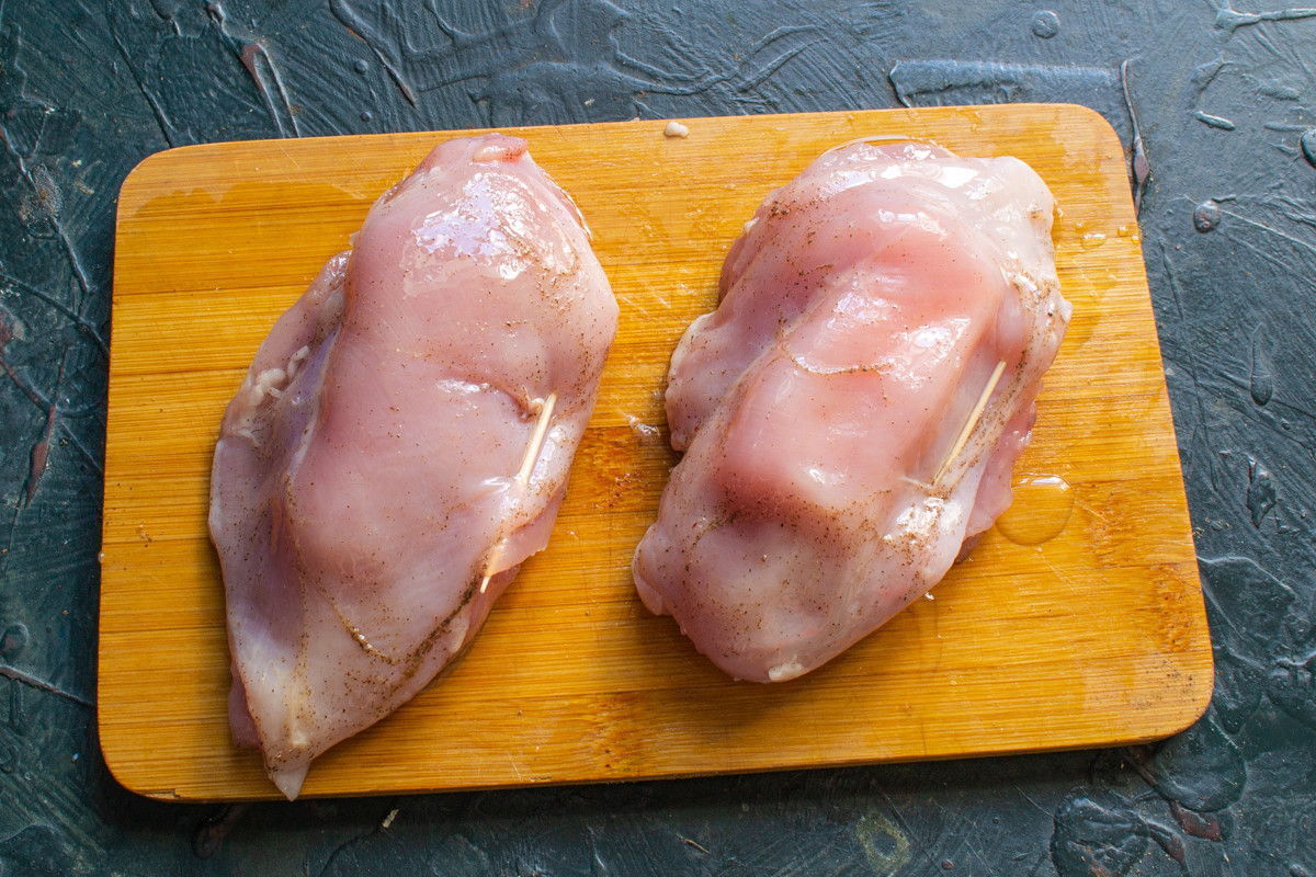 Скалываем карманы зубочистками или деревянными шпажками. Смазываем фаршированное куриное филе оливковым маслом со всех сторон.