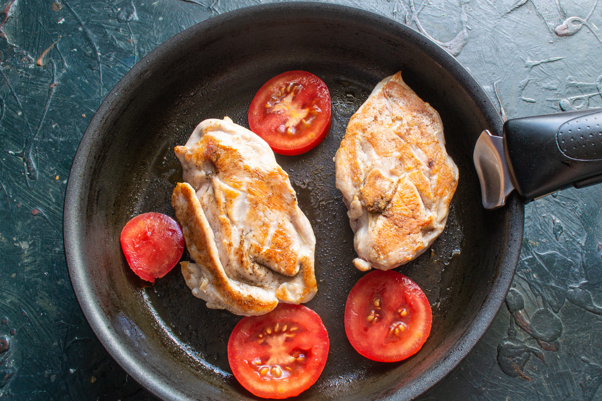 Один помидор нарезаем кружочками. Кладём ломтики помидора рядом с куриным филе. Обжариваем с двух сторон вместе с курицей до готовности мяса.