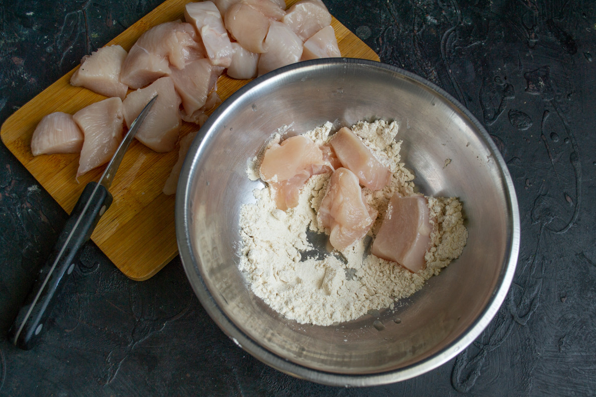Филе куриной грудки нарезаем кубиками размером 2х2 сантиметра. В глубокую миску насыпаем пшеничную муку, кладём кусочки курицы, панируем так, чтобы панировка покрыла их полностью.