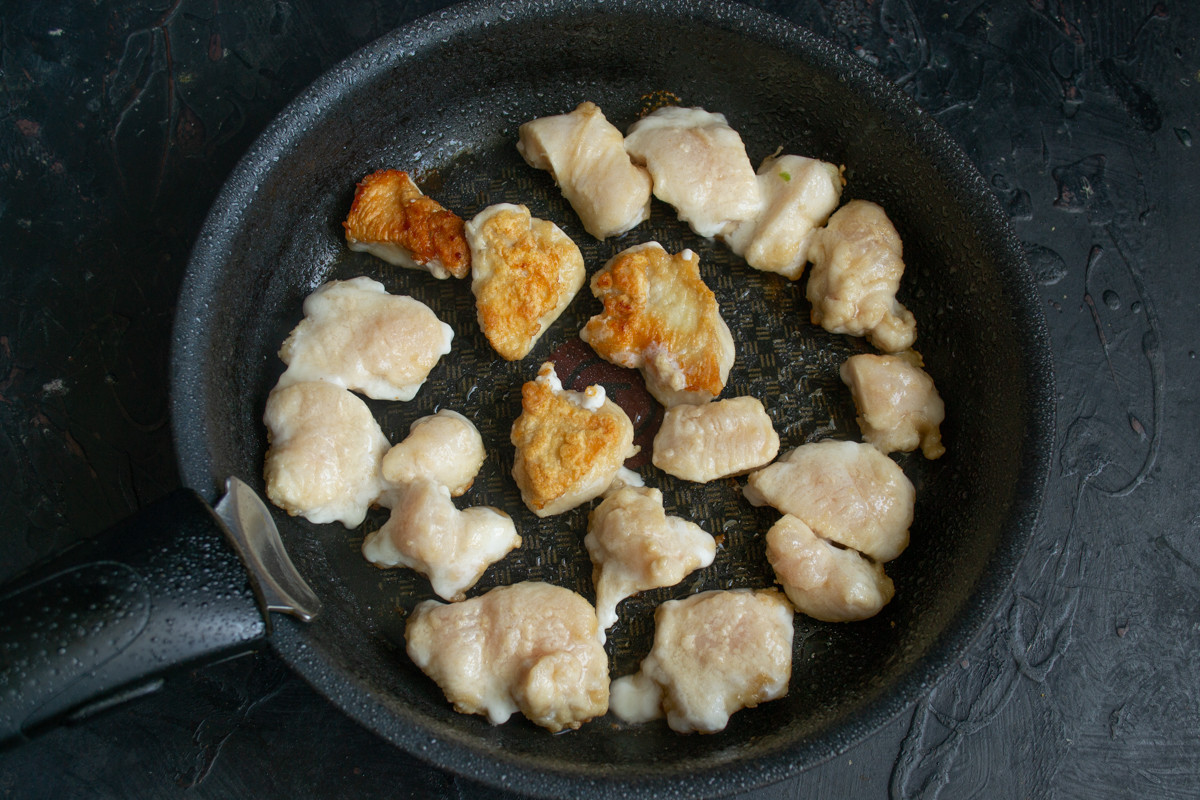 В широкую сковороду наливаем столовую ложку растительного масла для жарки. В разогретое масло выкладываем кусочки курицы в один слой, обжариваем до золотистого цвета.